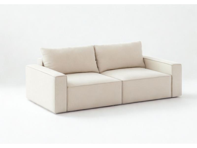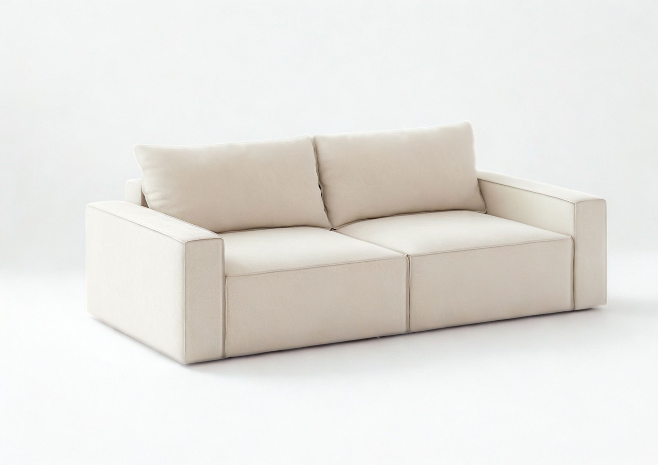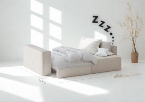 Sofa Sens 2 z Przeszyciami Zewnętrznymi - Wygodna sofa w stylu loft, industrial. Beżowy welur, funkcja spania 160x200cm, dwa pojemniki na pościel i dwie poduszki dla pełnego komfortu.