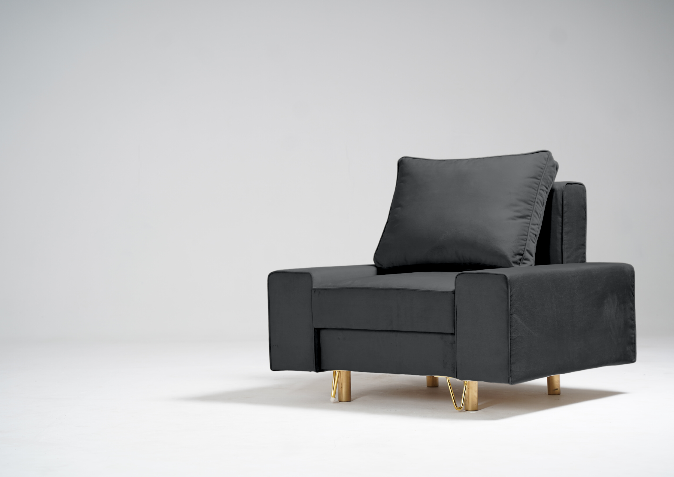 Tapicerowany Fotel z kolekcji STINO to fotel elegancki fotel na złotych metalowych nogach, który kryje pod siedziskiem pojemnik na drobiazgi. W kolekcji Stino dostępny jest również fotel rozkładany, sofa, pufa oraz narożnik.