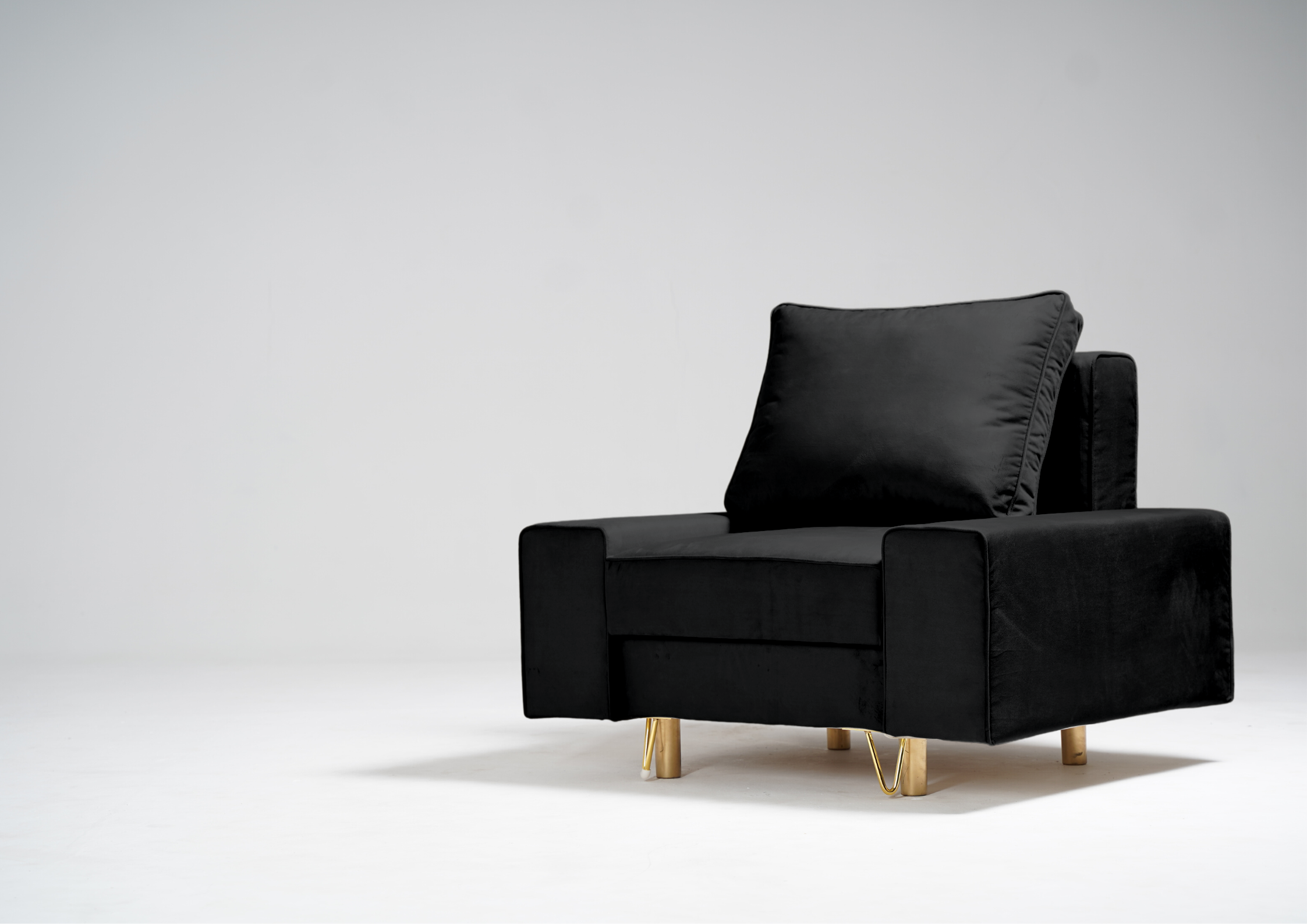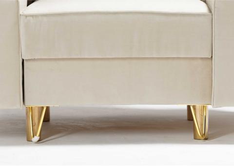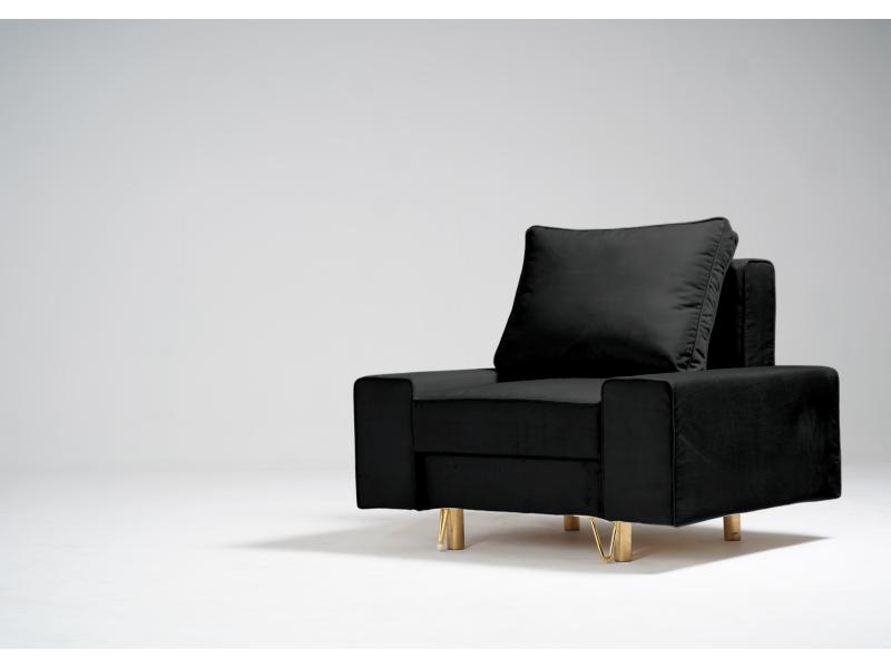 Tapicerowany Fotel z kolekcji STINO to fotel elegancki fotel na złotych metalowych nogach, który kryje pod siedziskiem pojemnik na drobiazgi. W kolekcji Stino dostępny jest również fotel rozkładany, sofa, pufa oraz narożnik.