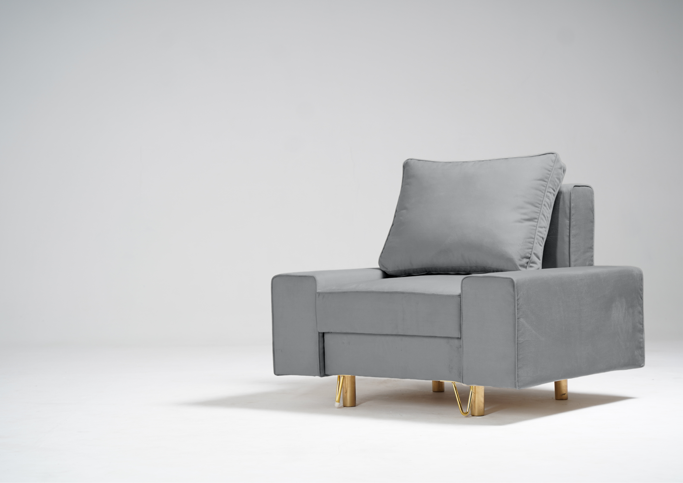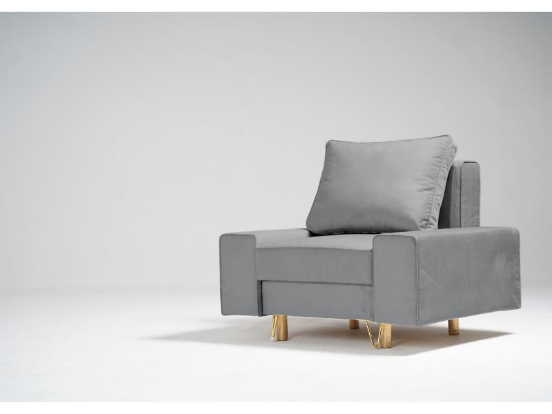 Tapicerowany Fotel z kolekcji STINO to fotel elegancki fotel na złotych metalowych nogach, który kryje pod siedziskiem pojemnik na drobiazgi. W kolekcji Stino dostępny jest również fotel rozkładany, sofa, pufa oraz narożnik.