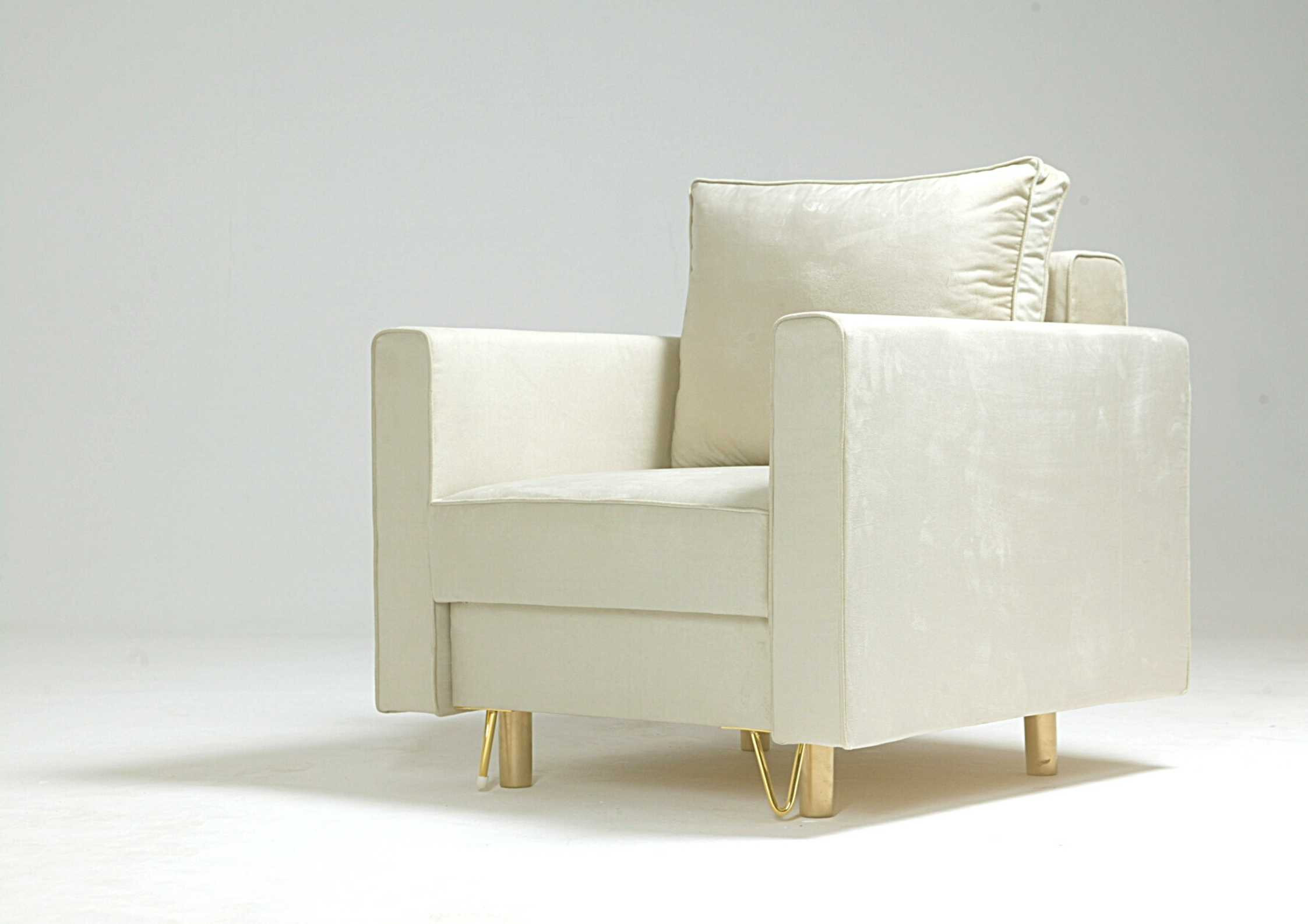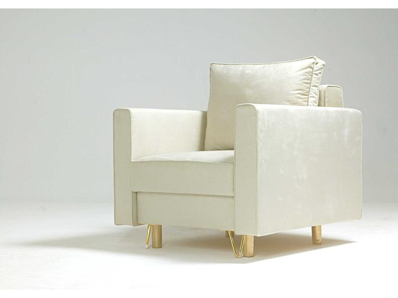 Tapicerowany Fotel z kolekcji DES to elegancki fotel na złotych metalowych nogach, który kryje pod siedziskiem pojemnik na drobiazgi. W kolekcji DES dostępny jest również fotel rozkładany, sofa, pufa oraz narożnik.