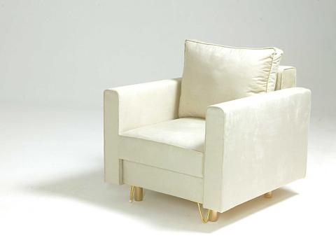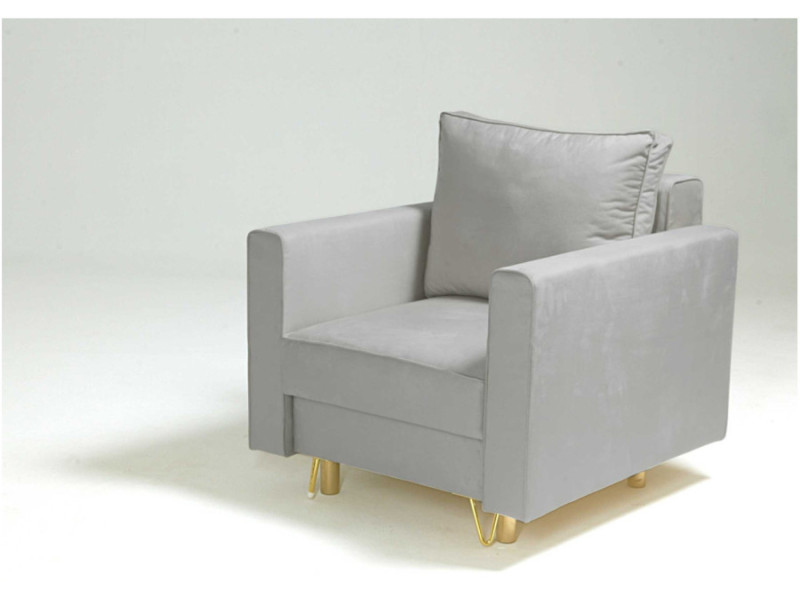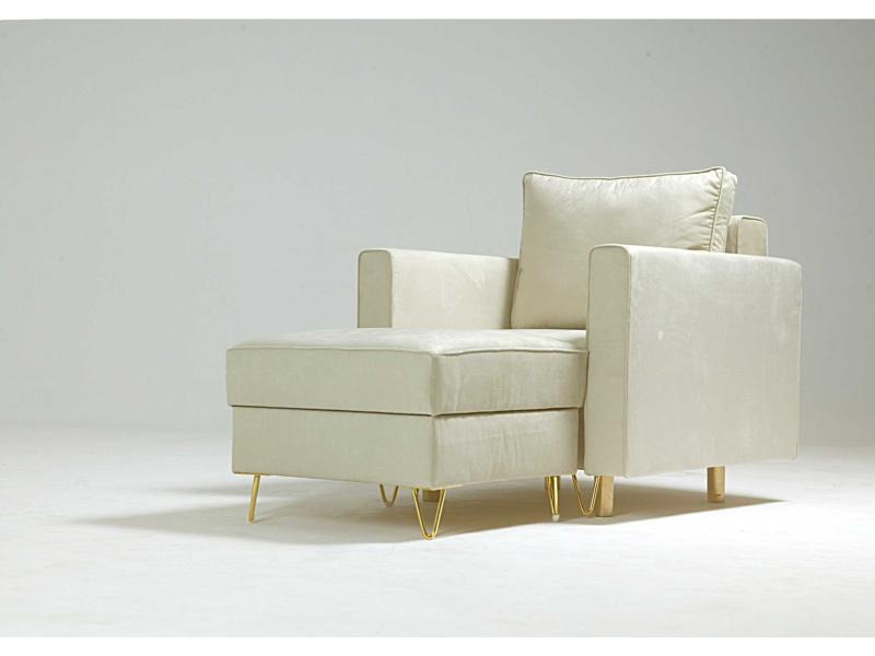 Tapicerowany Fotel z kolekcji DES to elegancki fotel na złotych metalowych nogach, który kryje pod siedziskiem pojemnik na drobiazgi. W kolekcji DES dostępny jest również fotel rozkładany, sofa, pufa oraz narożnik.