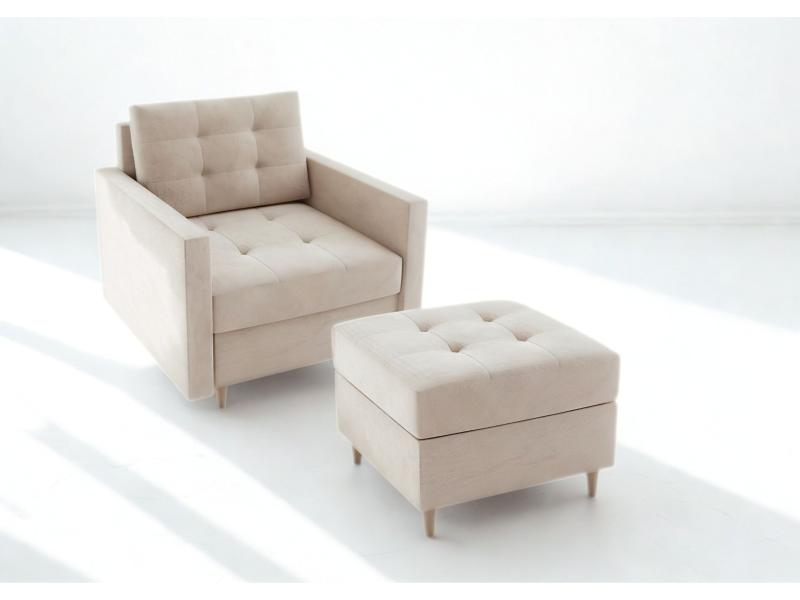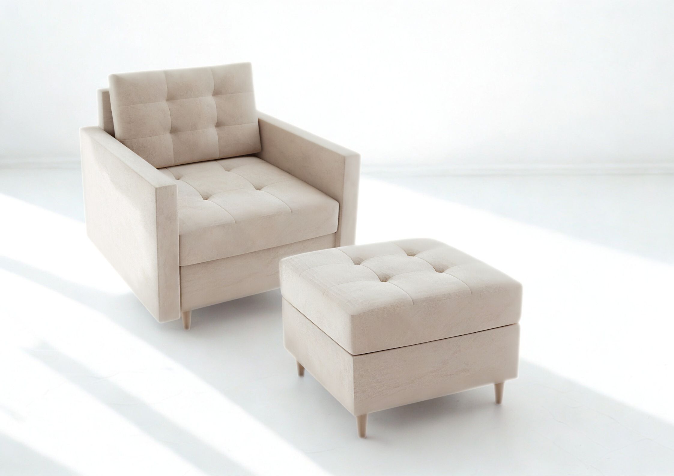 Fotel Tapicerowany z pufą VIDO Beżowy Welur Skandynawski do Salonu