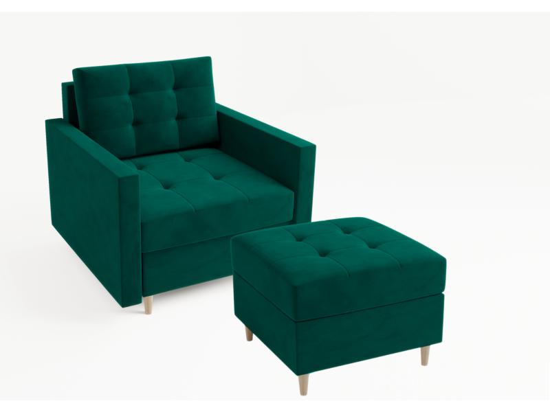Dane techniczne: Fotel Tapicerowany z pufą VIDO Zielony Welur Skandynawski do Salonu