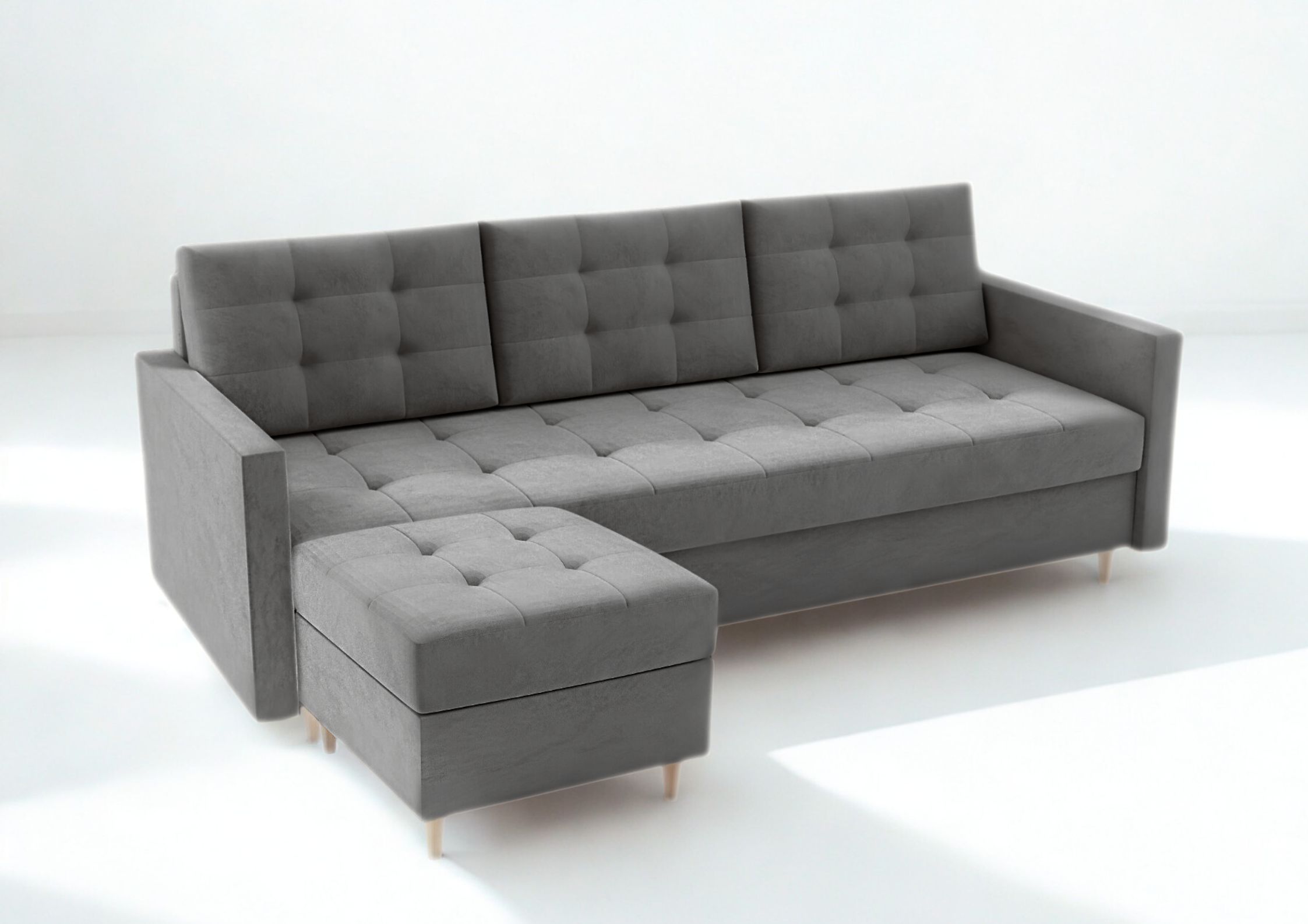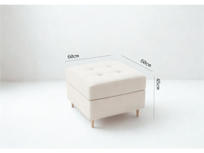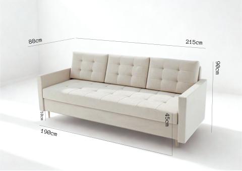Sofa posiada funkcję spania 140 × 190 cm na sprężynach bonell oraz pojemnik na pościel, dzięki czemu sprawdzi się do codziennego wypoczynku i snu. Praktyczna pufa ze schowkiem może służyć jako podnóżek, stolik lub przedłużenie sofy. Idealna do salonu i mniejszych przestrzeni.