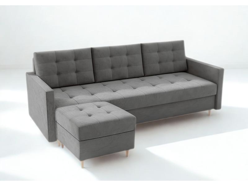 Grafitowa sofa VIDO z pufą to elegancka sofa w stylu glamour, wykonana z miękkiego weluru MANILA i osadzona na drewnianych nóżkach. Pikowane siedzisko nadaje jej nowoczesny i luksusowy wygląd.