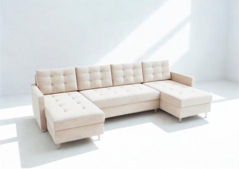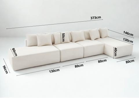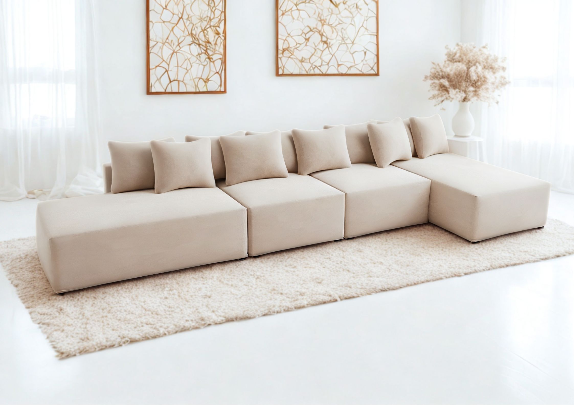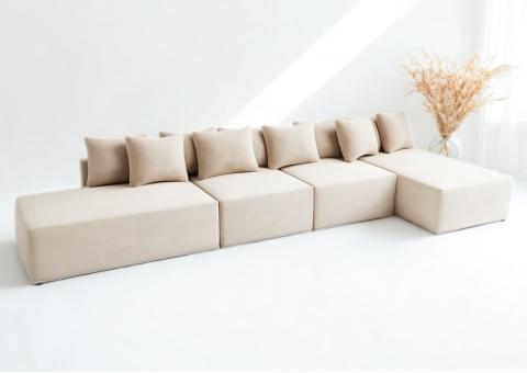 Komfortowy Narożnik Sugoi Modułowy - Narożnik Sugoi o szerokości 373cm, wykonany z beżowego weluru. Posiada 9 poduszek, prawostronny układ, funkcję spania (240x140cm) oraz modułowy design, zapewniający elastyczność aranżacji.