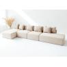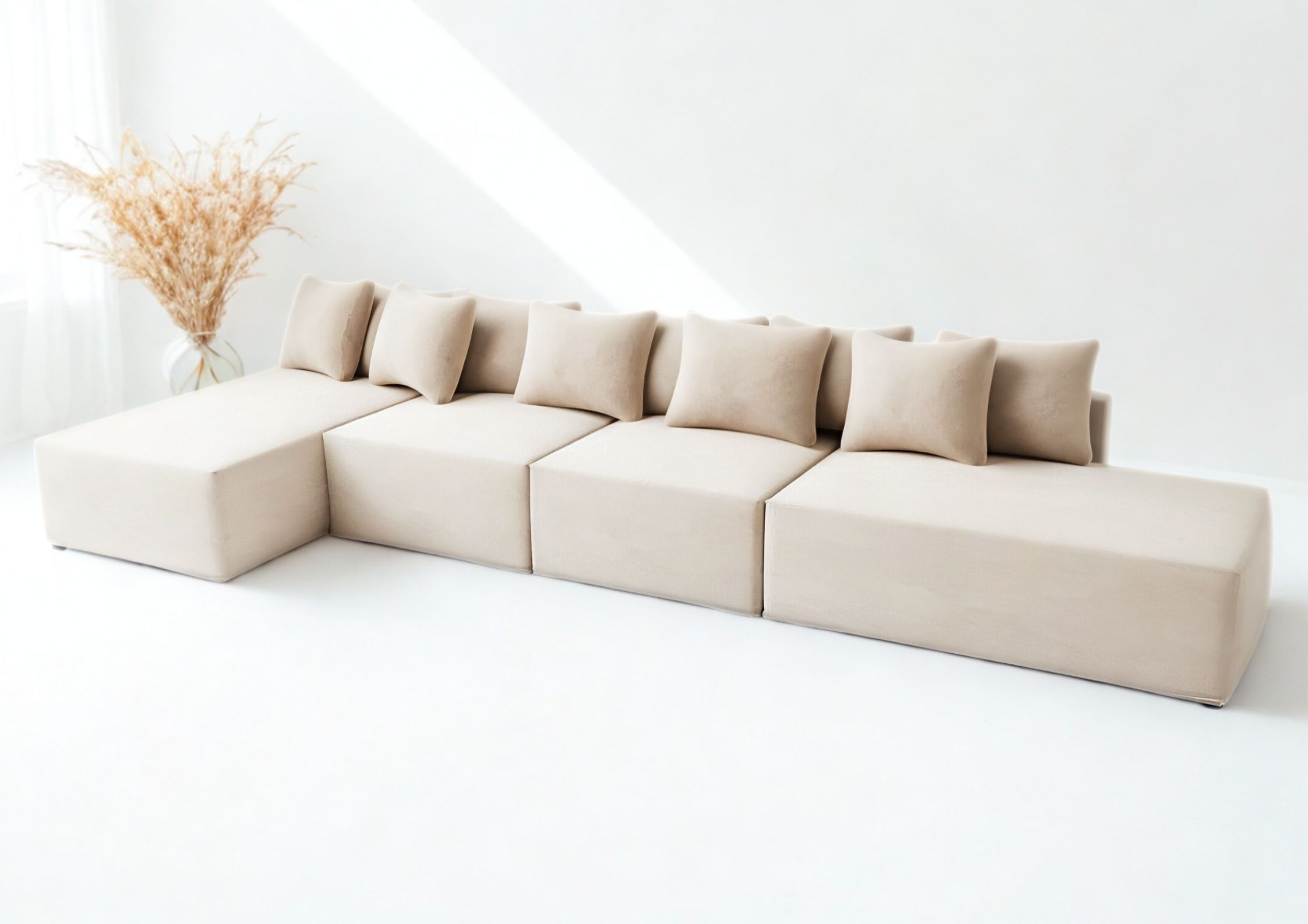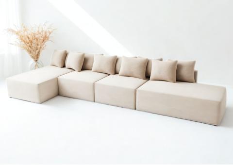 Beżowy Narożnik Sugoi Modułowy - Elegancki narożnik Sugoi w stylu loft, o szerokości 373cm. Wykonany z wysokiej jakości weluru, oferuje funkcję spania (240x140cm), 9 poduszek i lewostronny układ, doskonały do przestronnych salonów.