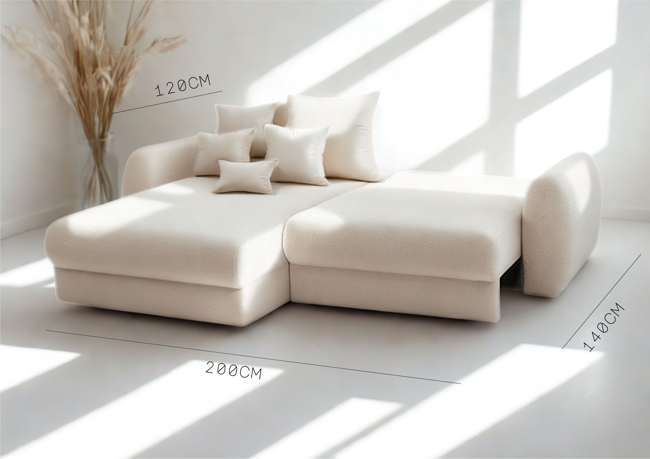 Mały narożnik lewostronny PALLA w kolorze beżowym to kompaktowy i funkcjonalny narożnik do salonu, idealny do mieszkań w bloku oraz nowoczesnych wnętrz w stylu loft. Model wyposażony jest w funkcję spania o powierzchni 140 × 240 cm oraz praktyczną skrzynię na pościel, co czyni go doskonałym wyborem do codziennego użytkowania. Komfort siedzenia i snu zapewniają sprężyny bonell na całej powierzchni spania, głębokie siedzisko oraz stabilna poduszka oparciowa. Narożnik wykonano z eleganckiego weluru MANILA w kolorze beżowym, który jest miękki w dotyku, odporny na mechacenie i łatwy w czyszczeniu.. Narożnik PALLA łączy nowoczesny design, wygodę i praktyczne rozwiązania, idealne do małego salonu lub pokoju dziennego.