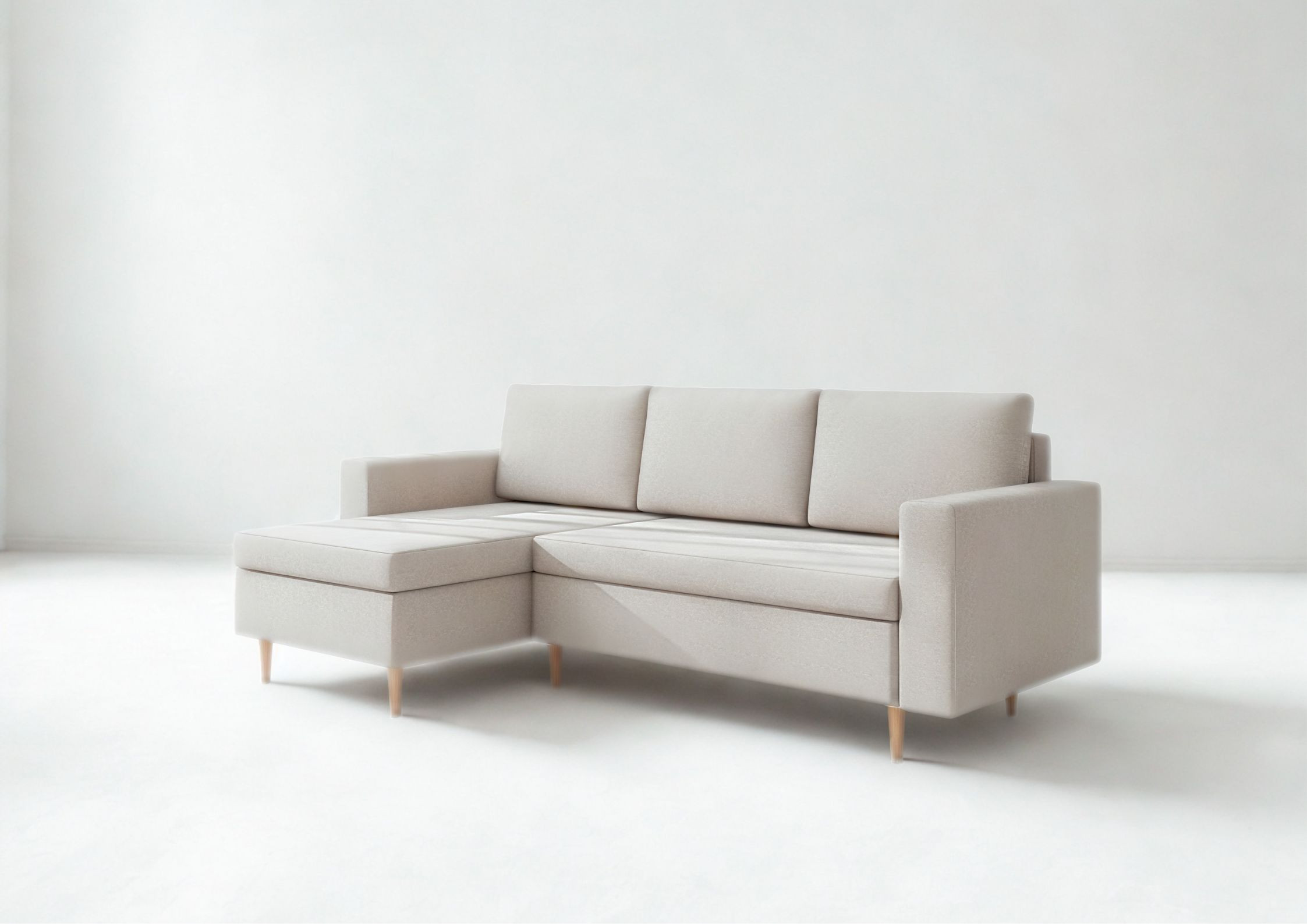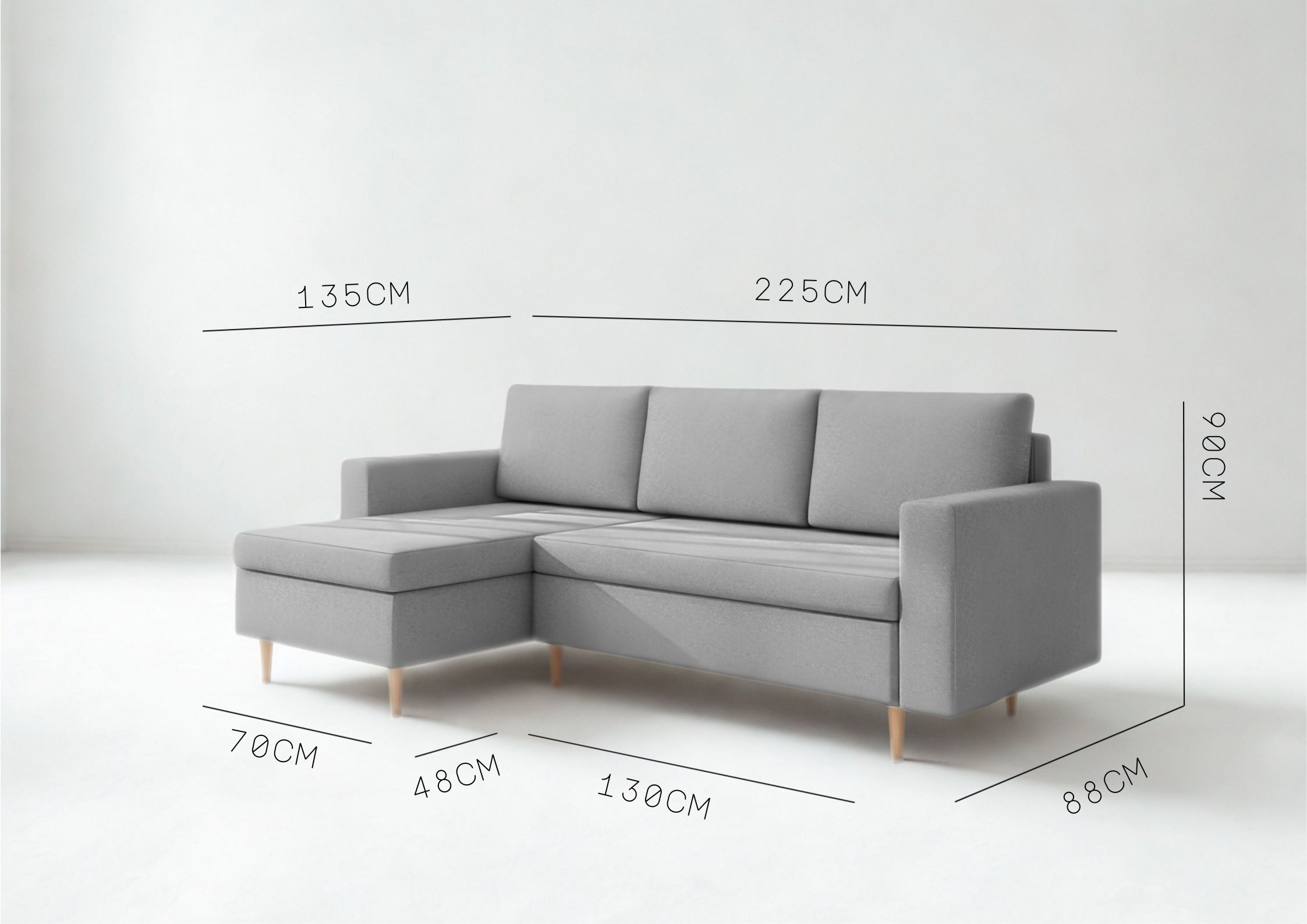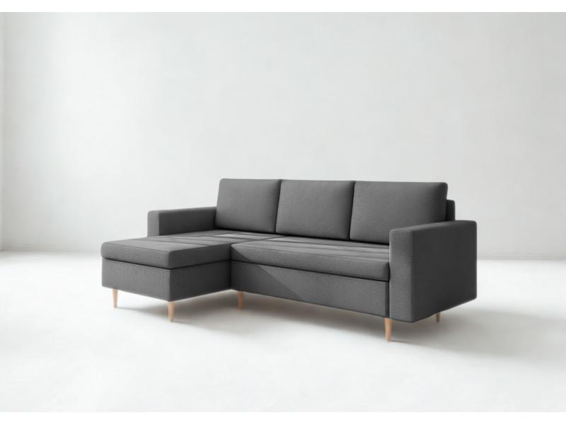 Narożni skandynawski Bever to mebel który, jest doskonałą propozycją dla osób ceniących sobie minimalizm, nowoczesność oraz funkcjonalność.w stylu skandynawskim. Narożnik rozkładany z funkcją spania oraz dodatkową przestrzeń na pościel. Narożnika drewnianych nóżkach.