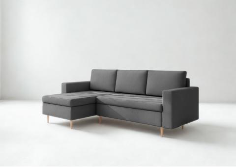 - Narożnik rozkładany z funkcją spania, który idealnie nada się zarówno do małego pokoju w bloku jak i w większych pomieszczeniach.