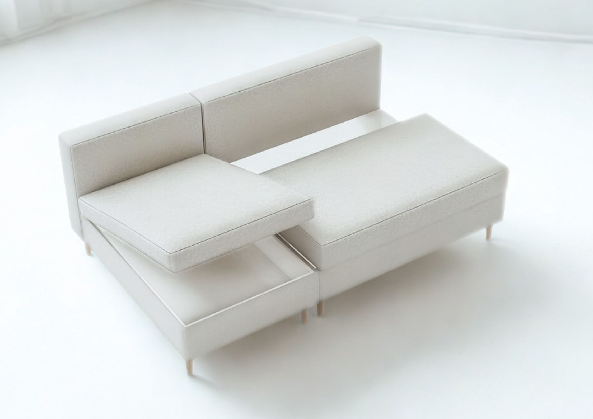 - Pod siedziskiem funkcyjnym jak i w narożnikowej części mebla zostały zamontowane 2 skrzynie na pościel, dzięki czemu zyskują Państwo dużą powierzchnię do przechowywania.