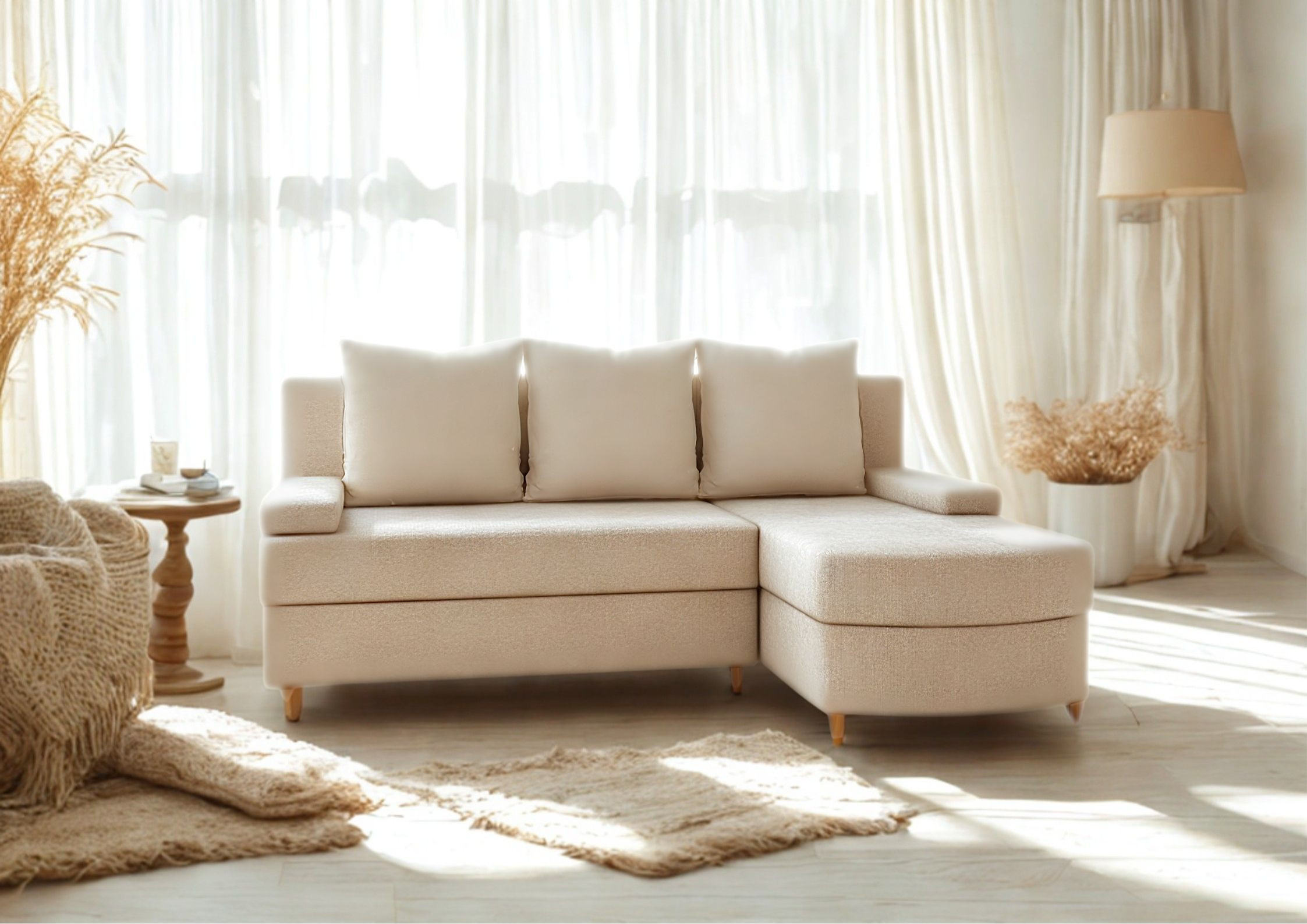 Narożnik Rozkładany Prawostronny HELIOS Beżowy Funkcja Spania Salon