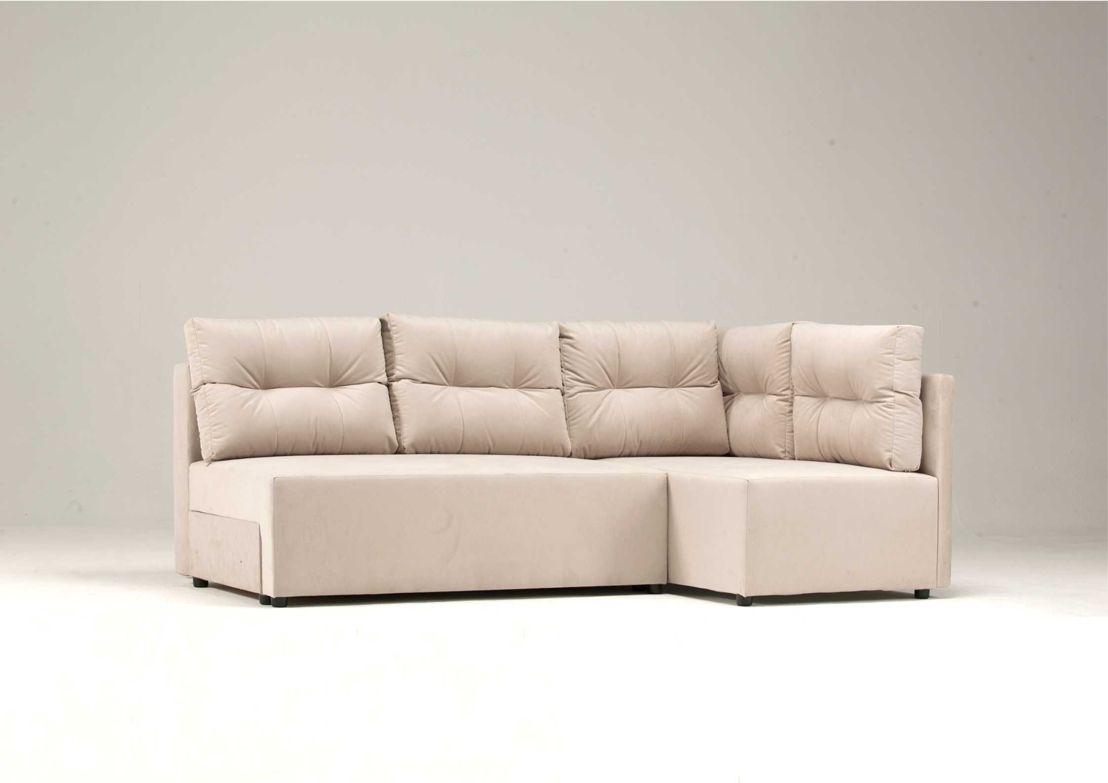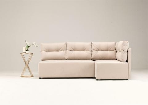 Kanapa narożna prawa produkowana w wymiarze 208x140cm jest meblem idealnym dla małych pomieszczeń. Rogówka rozkłada się do funkcji spania, posiada 1 pojemnik na pościel pod powierzchnią siedziskową. Narożnik wyposażyliśmy w 5 dużych pikowanych poduszek, które od strony ściany mają również podporę, by zapobiegać jej brudzeniu.