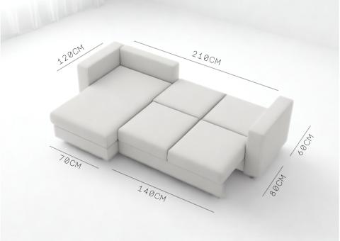 - Narożnik rozkładany z funkcją spania, który idealnie nada się zarówno do małego pokoju w bloku jak i w większych pomieszczeniach.