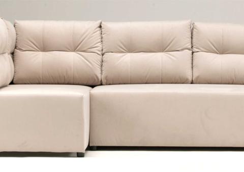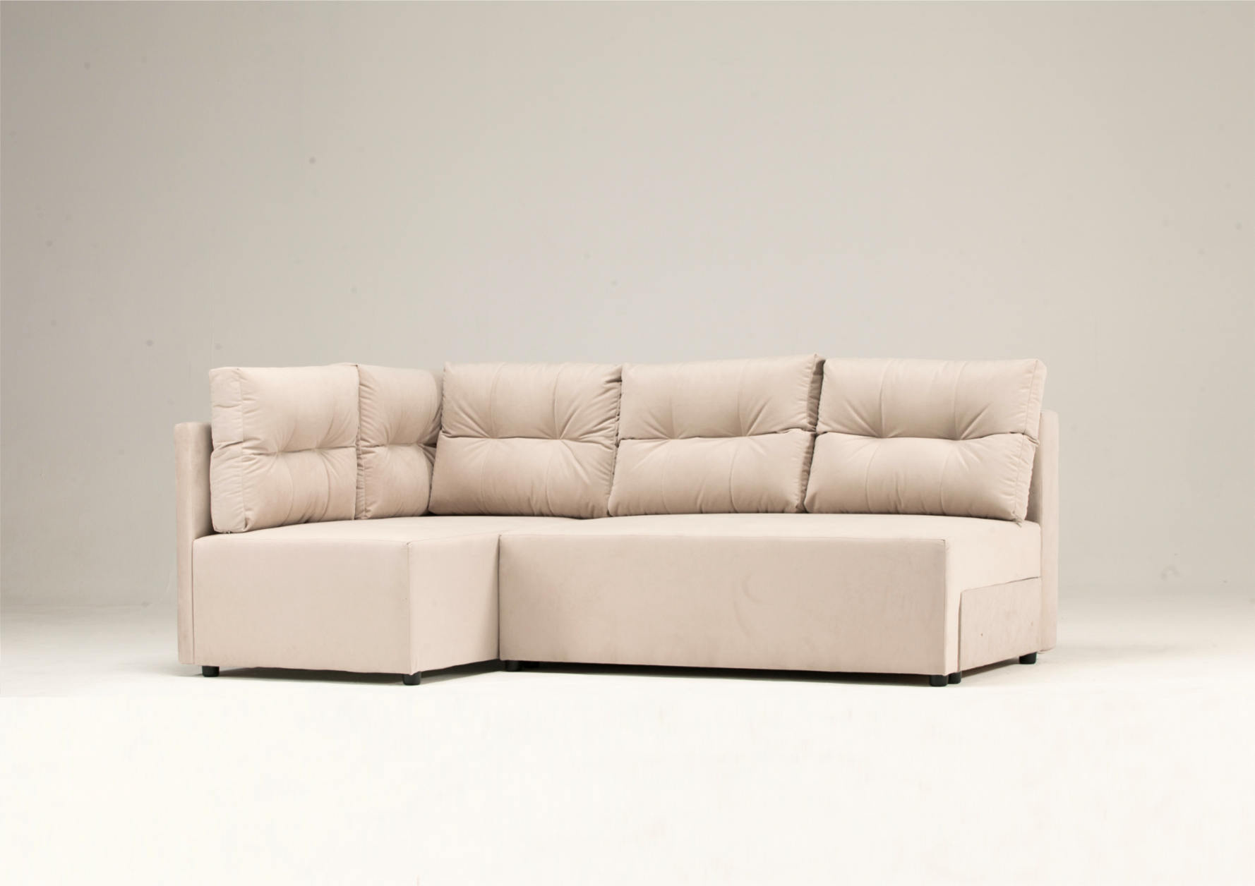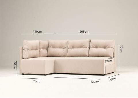 Kanapa narożna lewa produkowana w wymiarze 208x140cm jest meblem idealnym dla małych pomieszczeń. Rogówka rozkłada się do funkcji spania, posiada 1 pojemnik na pościel pod powierzchnią siedziskową. Narożnik wyposażyliśmy w 5 dużych pikowanych poduszek, które od strony ściany mają również podporę, by zapobiegać jej brudzeniu.