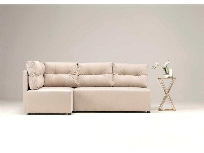 Kanapa narożna lewa produkowana w wymiarze 208x140cm jest meblem idealnym dla małych pomieszczeń. Rogówka rozkłada się do funkcji spania, posiada 1 pojemnik na pościel pod powierzchnią siedziskową. Narożnik wyposażyliśmy w 5 dużych pikowanych poduszek, które od strony ściany mają również podporę, by zapobiegać jej brudzeniu.