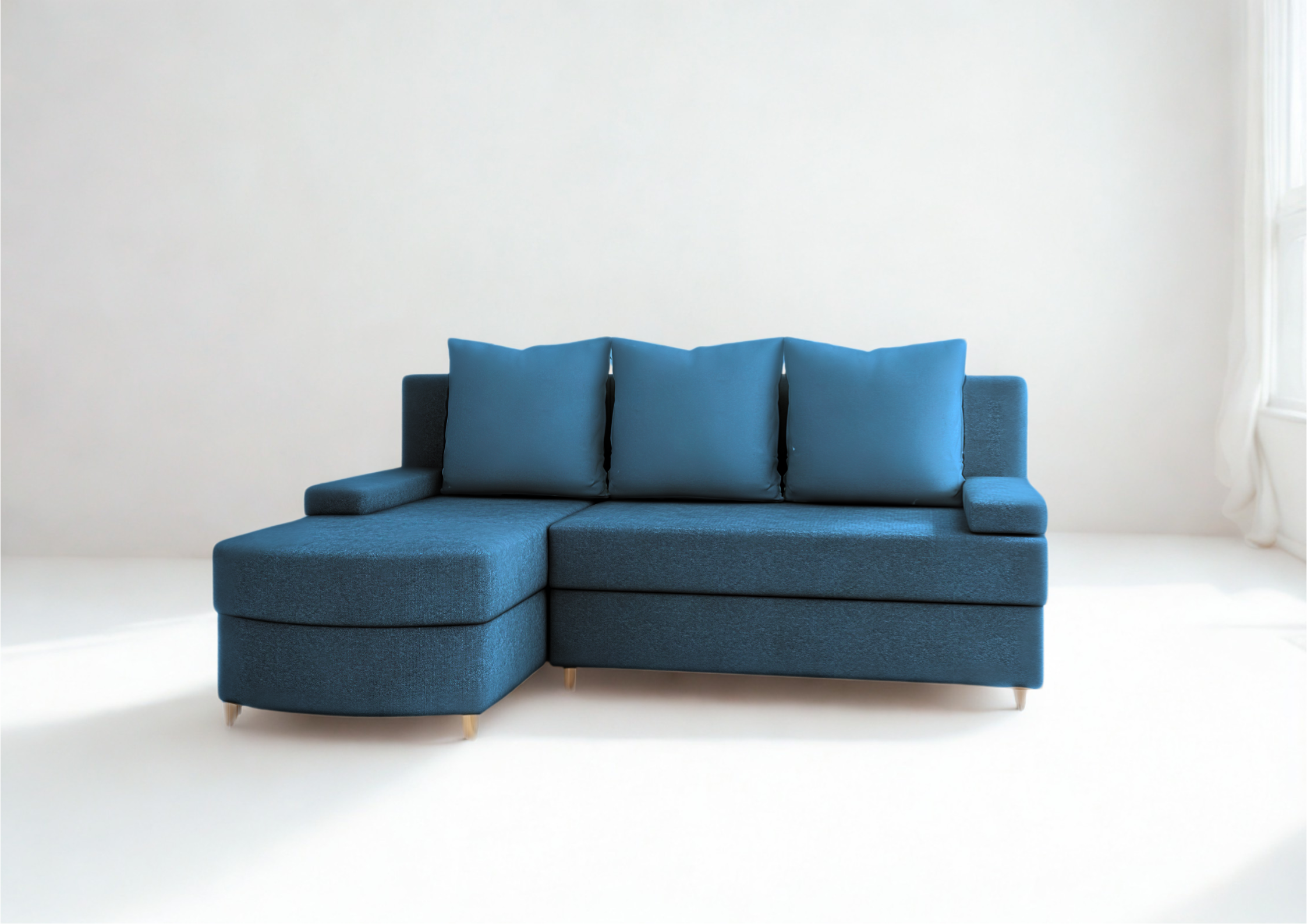 - Narożnik rozkładany z funkcją spania, który idealnie nada się zarówno do małego pokoju w bloku jak i w większych pomieszczeniach.