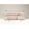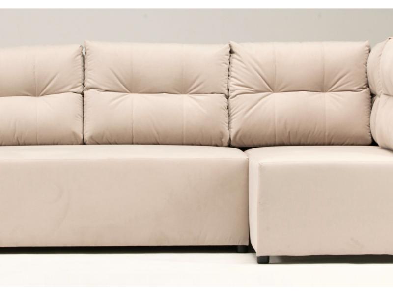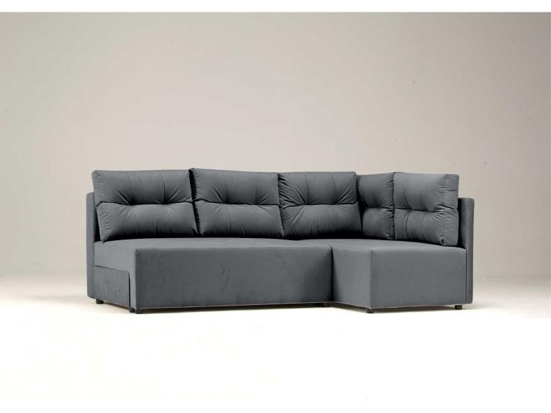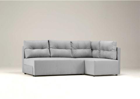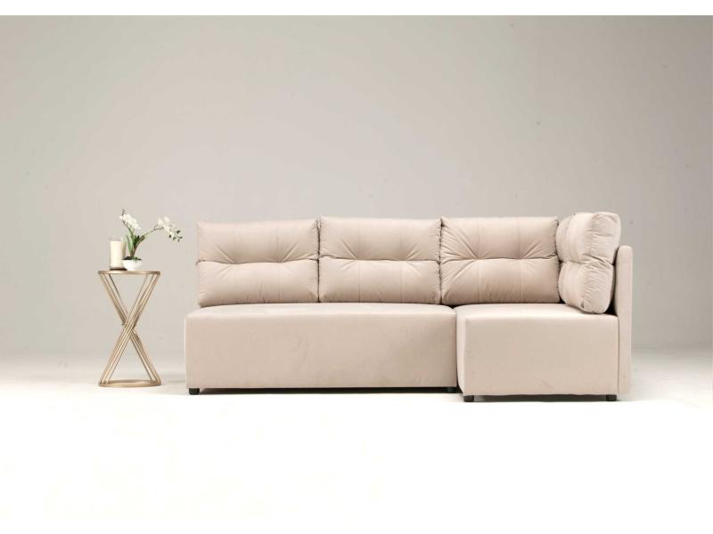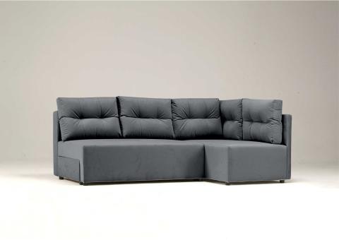 Kanapa narożna prawa produkowana w wymiarze 208x140cm jest meblem idealnym dla małych pomieszczeń. Rogówka rozkłada się do funkcji spania, posiada 1 pojemnik na pościel pod powierzchnią siedziskową. Narożnik wyposażyliśmy w 5 dużych pikowanych poduszek, które od strony ściany mają również podporę, by zapobiegać jej brudzeniu.