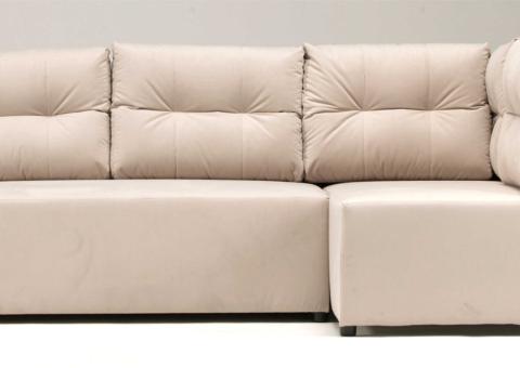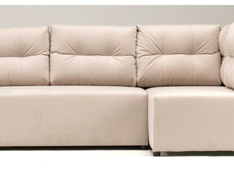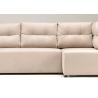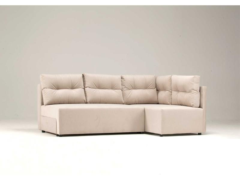 Kanapa narożna prawa produkowana w wymiarze 208x140cm jest meblem idealnym dla małych pomieszczeń. Rogówka rozkłada się do funkcji spania, posiada 1 pojemnik na pościel pod powierzchnią siedziskową. Narożnik wyposażyliśmy w 5 dużych pikowanych poduszek, które od strony ściany mają również podporę, by zapobiegać jej brudzeniu.