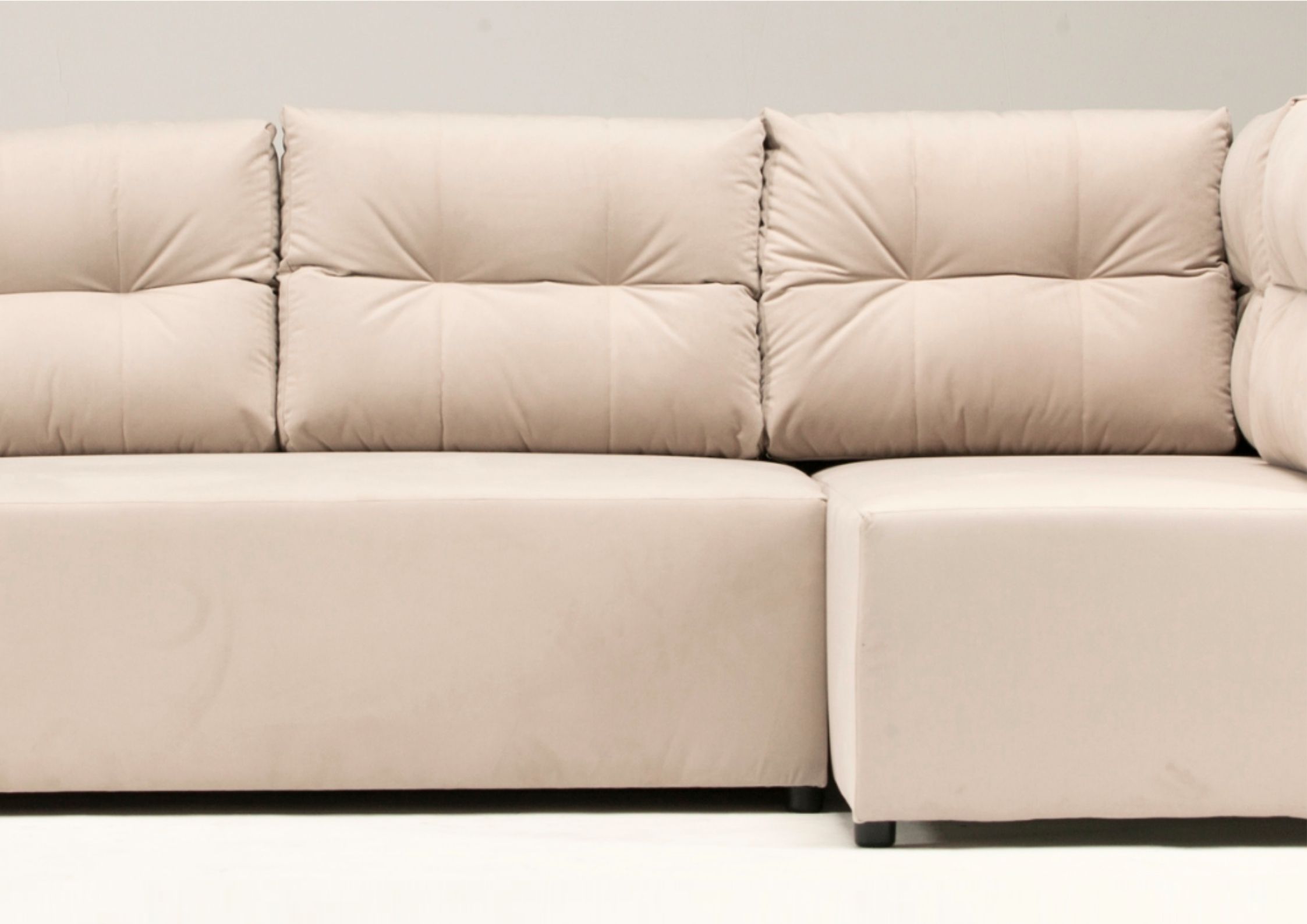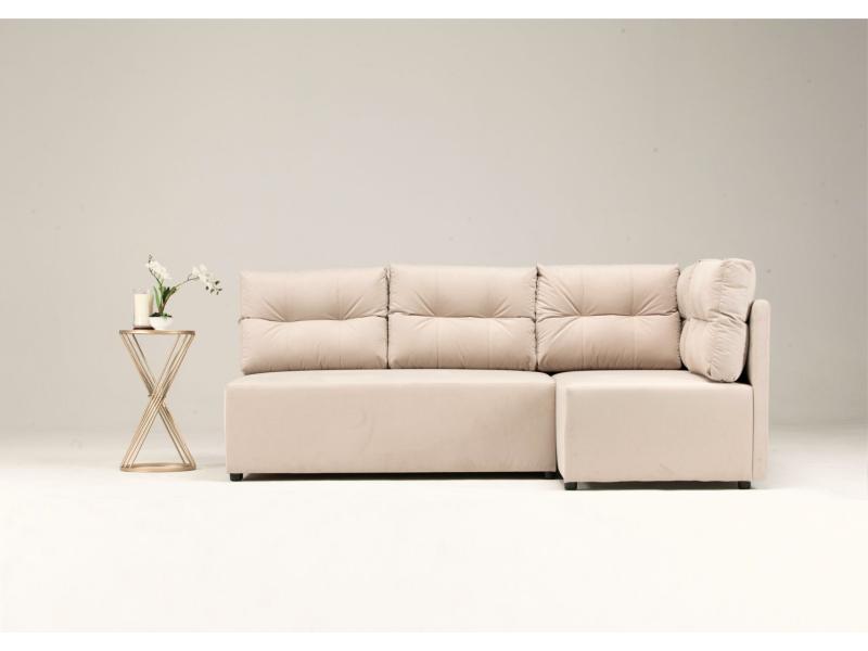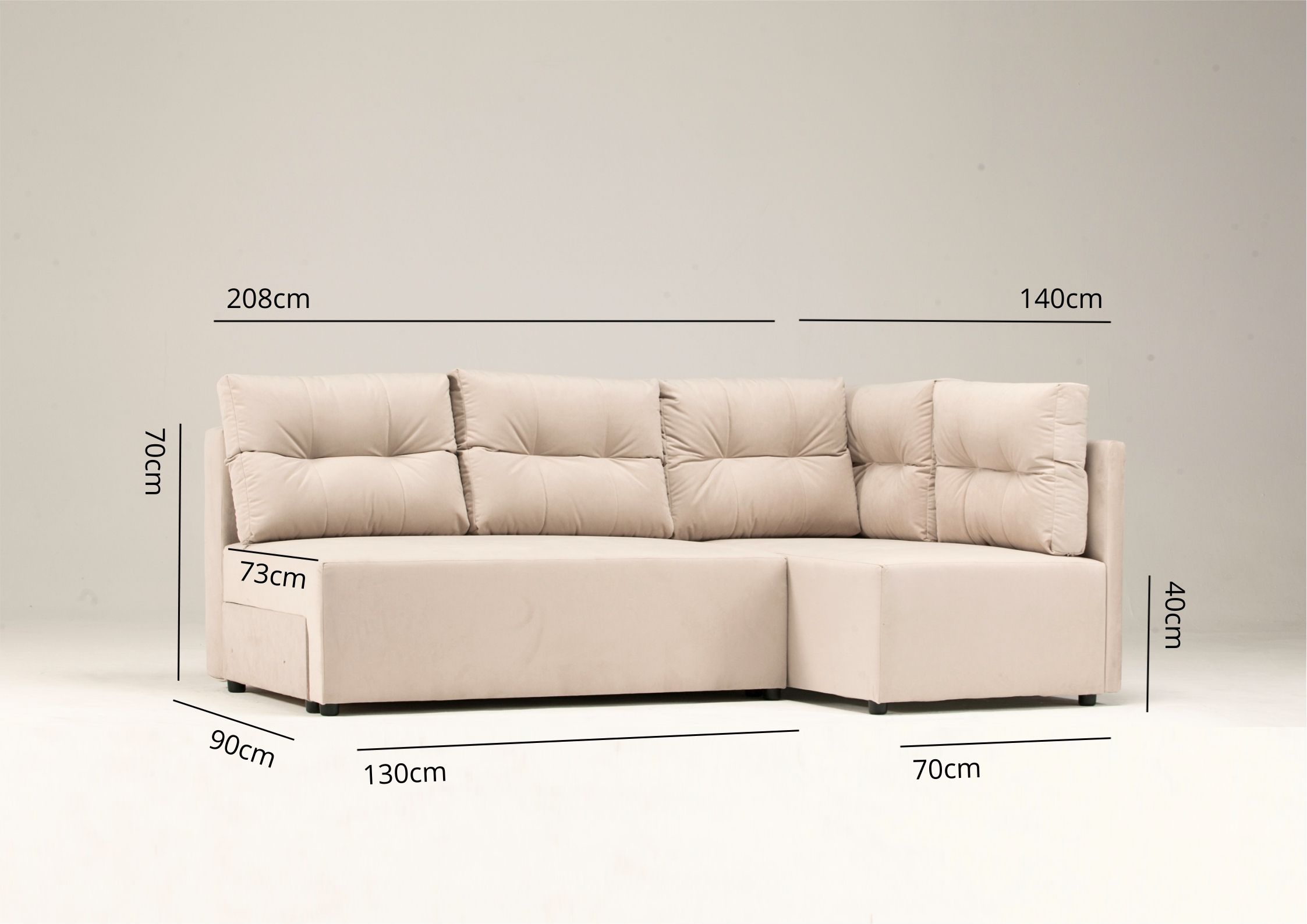 Kanapa narożna prawa produkowana w wymiarze 208x140cm jest meblem idealnym dla małych pomieszczeń. Rogówka rozkłada się do funkcji spania, posiada 1 pojemnik na pościel pod powierzchnią siedziskową. Narożnik wyposażyliśmy w 5 dużych pikowanych poduszek, które od strony ściany mają również podporę, by zapobiegać jej brudzeniu.