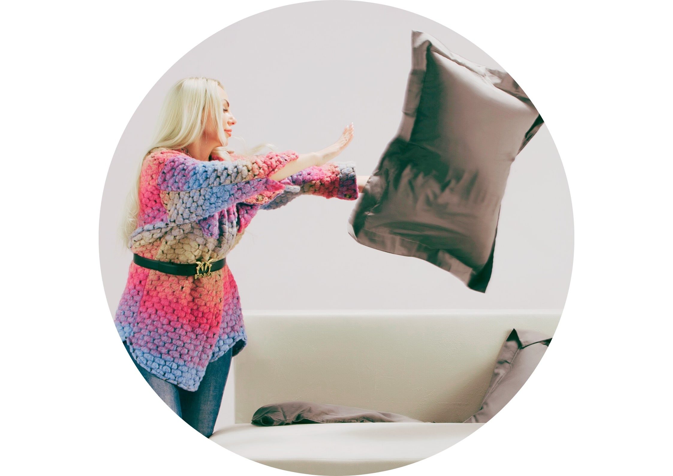 - Duże poduszki wypełniane granulatem piankowym tworzą stabilne oparcie.
