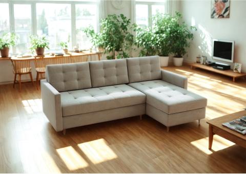 - Narożnik rozkładany z funkcją spania, który idealnie nada się zarówno do małego pokoju w bloku jak i w większych pomieszczeniach.