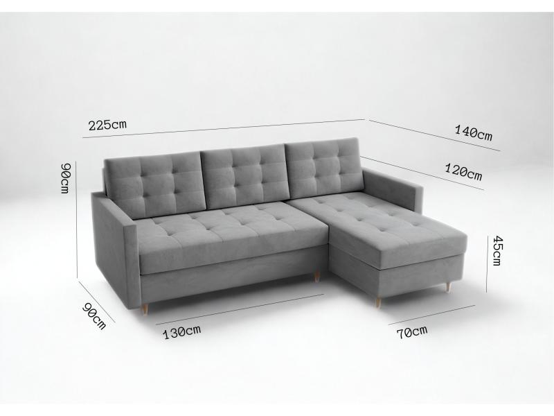Prawostronny narożnik VIDO to harmonijne połączenie wysokiej funkcjonalności i uniwersalnego designu, dopasowanego do różnych stylów wnętrz – od nowoczesnych, przez skandynawskie, aż po klasyczne aranżacje. Mebel został wyposażony w funkcję spania, zapewniającą komfortowy wypoczynek na co dzień, oraz dwa pojemne schowki na pościel, które pomagają utrzymać porządek i maksymalnie wykorzystać przestrzeń. Sprężyny bonell na całej powierzchni spania gwarantują trwałość i wygodę użytkowania, a dekoracyjne pikowania i poduszki oparciowe nadają całości elegancki, ponadczasowy charakter. Dzięki przemyślanej formie narożnik VIDO doskonale sprawdzi się zarówno w mniejszych pomieszczeniach, jak i w przestronnych salonach.