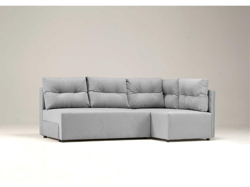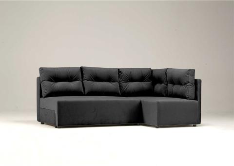 Kanapa narożna prawa produkowana w wymiarze 208x140cm jest meblem idealnym dla małych pomieszczeń. Rogówka rozkłada się do funkcji spania, posiada 1 pojemnik na pościel pod powierzchnią siedziskową. Narożnik wyposażyliśmy w 5 dużych pikowanych poduszek, które od strony ściany mają również podporę, by zapobiegać jej brudzeniu.