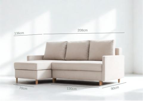 - Narożnik rozkładany z funkcją spania, który idealnie nada się zarówno do małego pokoju w bloku jak i w większych pomieszczeniach.