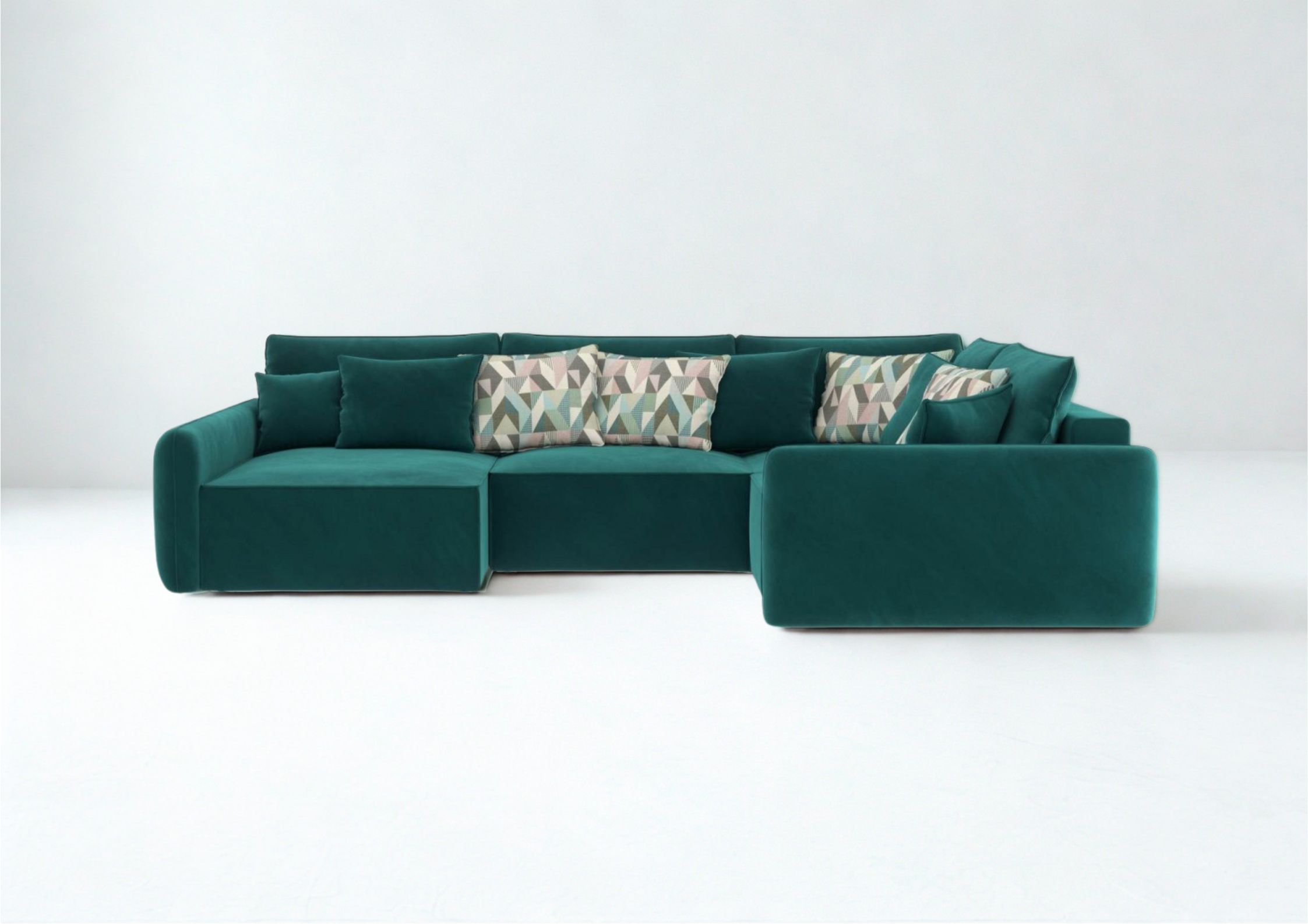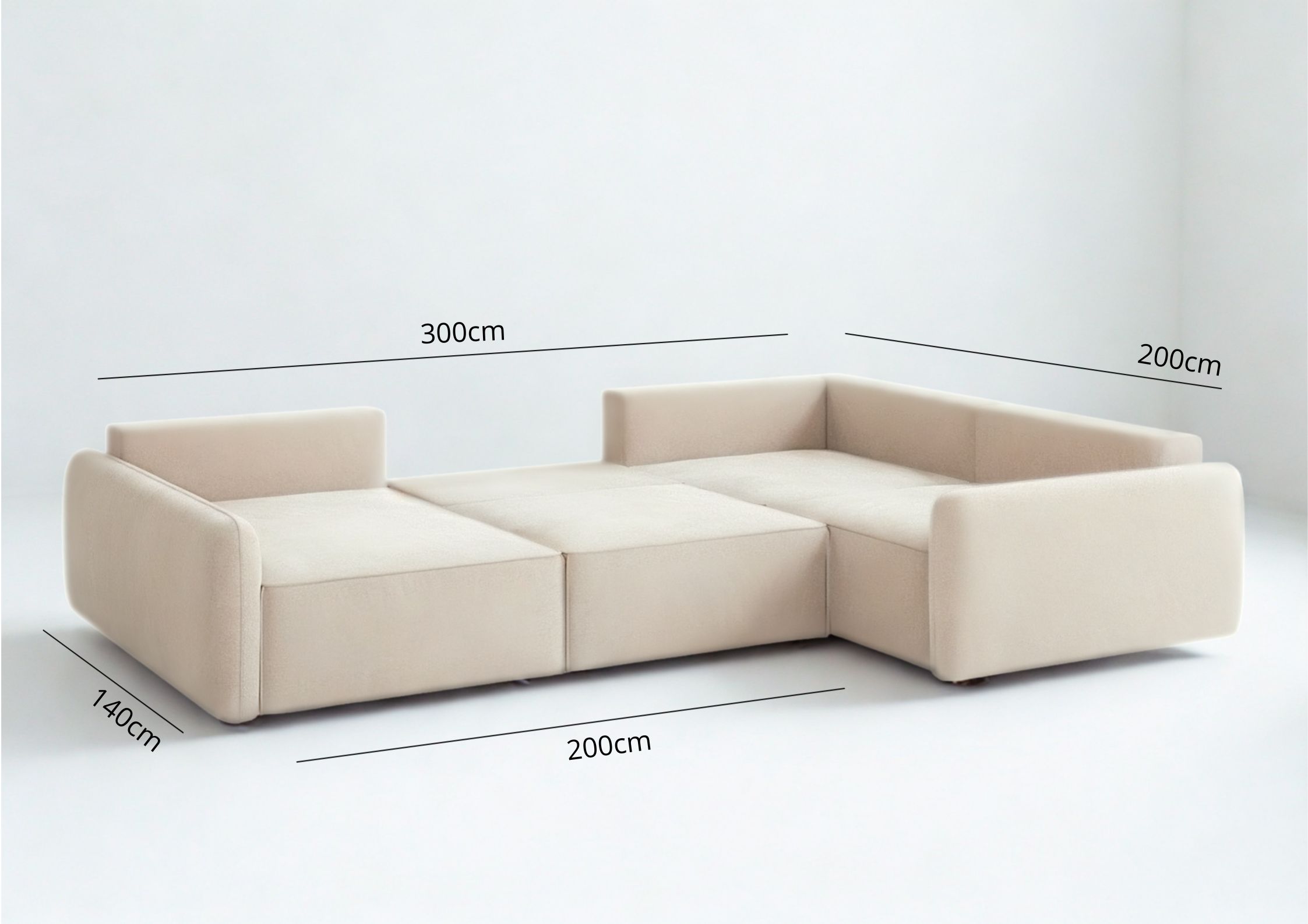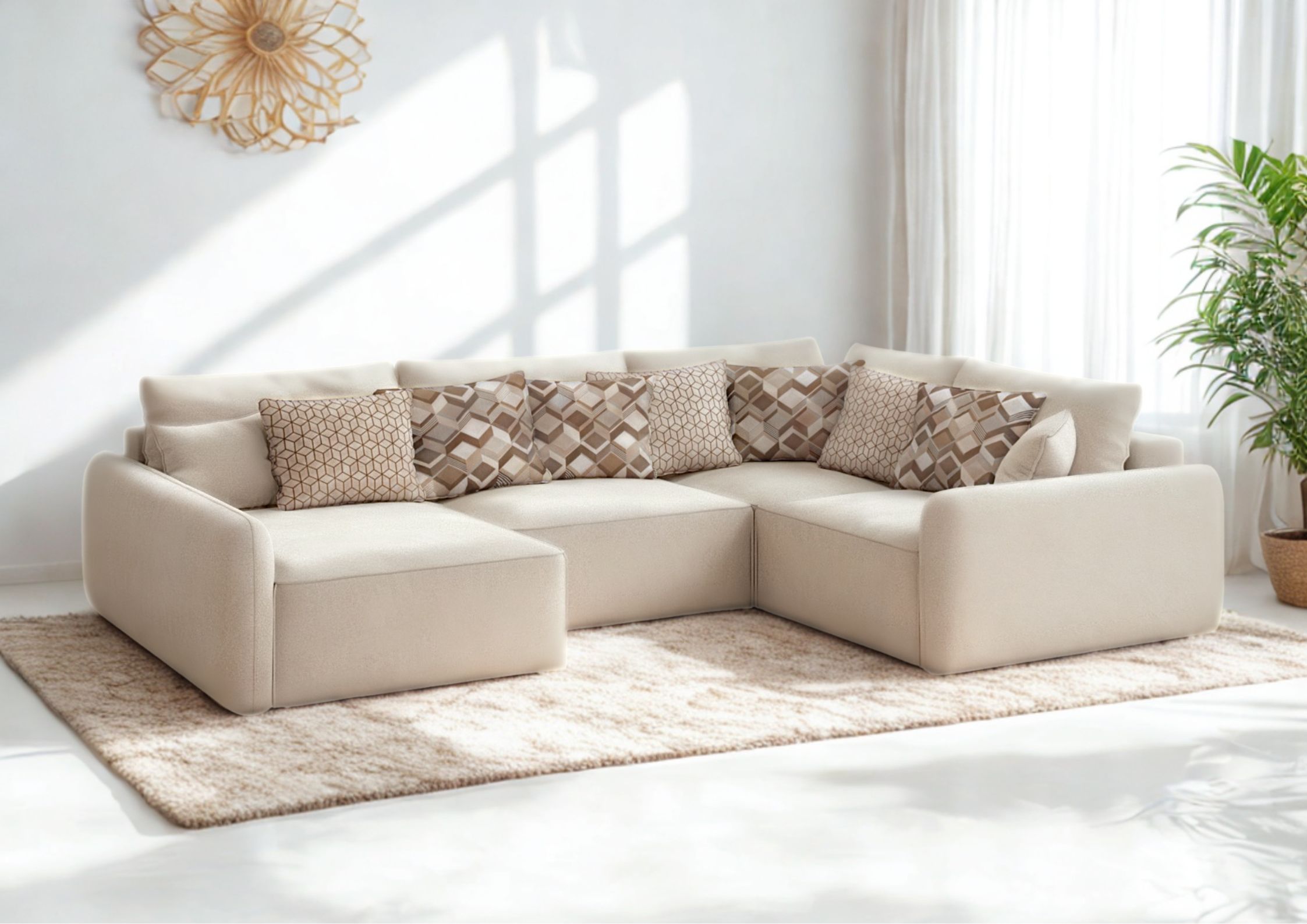 To propozycja do większych salonów. Głębokie siedziska zapewniają funkcję relaksu po całym dniu pracy. Dodatkowo zaprojektowaliśmy w nim funkcję spania, dzięki czemu Twoi goście mogą zostać na dłużej. Duże poduszki oparciowe sprawi, że oprzesz się komfortowo na meblu. Mniejsze są elementami aranżacji- do dokupienia oddzielnie. Narożnik składa się z modułów.