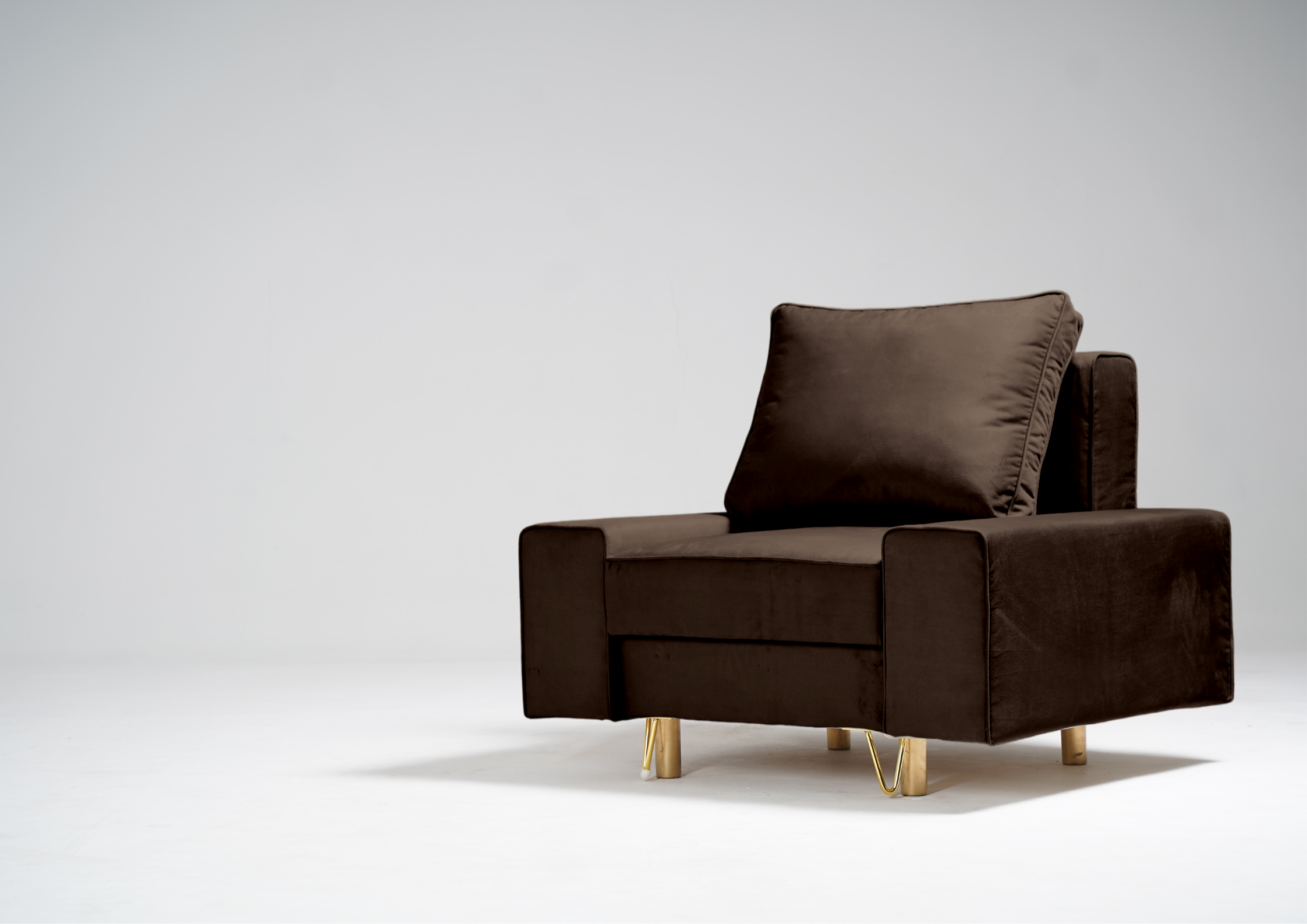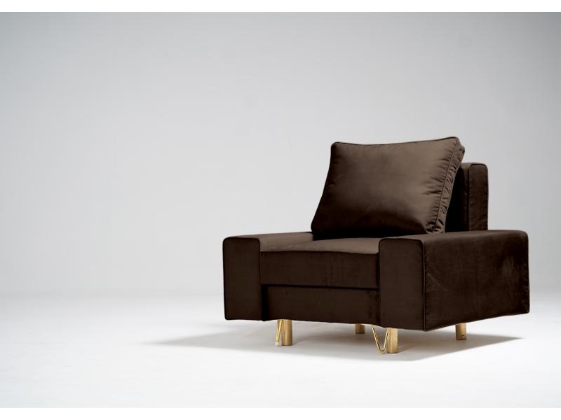 Tapicerowany Fotel z kolekcji STINO to fotel elegancki fotel na złotych metalowych nogach, który kryje pod siedziskiem pojemnik na drobiazgi. W kolekcji Stino dostępny jest również fotel rozkładany, sofa, pufa oraz narożnik.