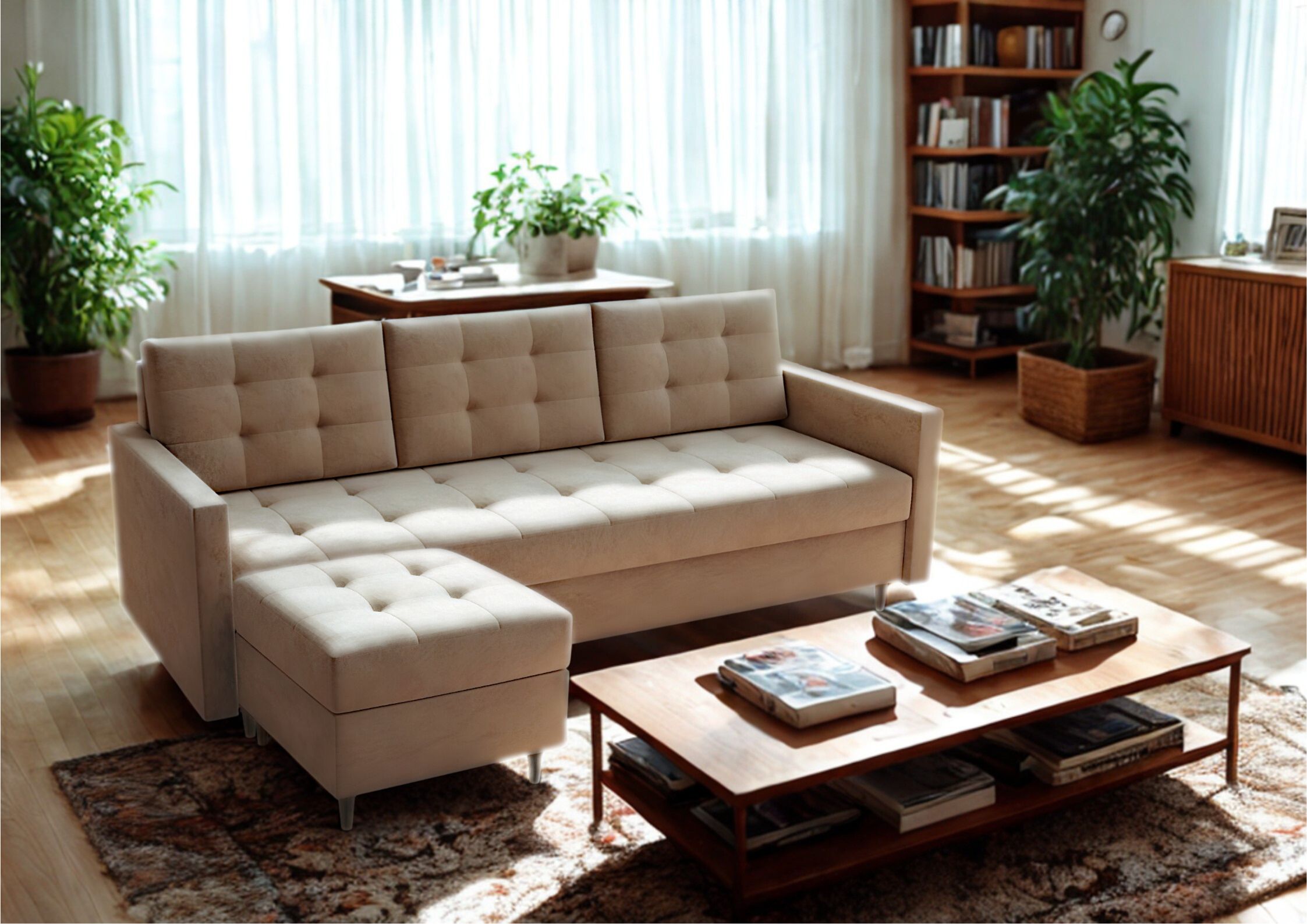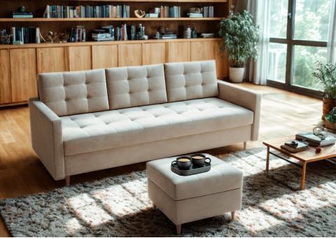 Sofa posiada funkcję spania 140 × 190 cm na sprężynach bonell oraz pojemnik na pościel, dzięki czemu sprawdzi się do codziennego wypoczynku i snu. Praktyczna pufa ze schowkiem może służyć jako podnóżek, stolik lub przedłużenie sofy. Idealna do salonu i mniejszych przestrzeni.