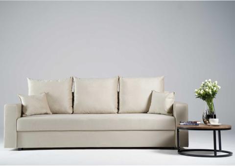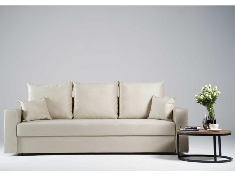 - Sofa z funkcją spania, który idealnie nada się zarówno do małego pokoju w bloku jak i w większych pomieszczeniach.