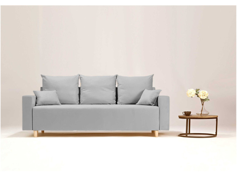 Skandynawska sofa Ever jest wykonywana w rozmiarze 215x90cm. Głębokość siedziska to 73cm. 3 duże poduszki szyte na zamkach z wymiennymi wkładami. Kanapa rozkładana do funkcji spania z dużym pojemnikiem pod całą powierzchnią siedziskową kanapy. Skandynawski design podkreślony przez nogi z naturalnego drewna. Do wyboru w cenie 4 rodzaje tkanin.
