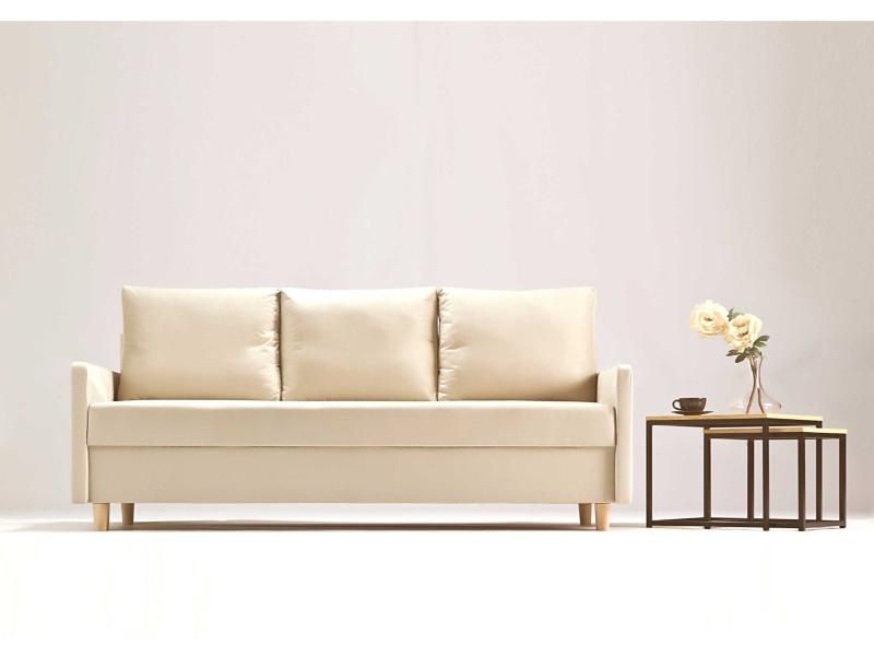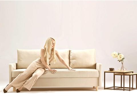 - Sofa z funkcją spania, który idealnie nada się zarówno do małego pokoju w bloku jak i w większych pomieszczeniach.