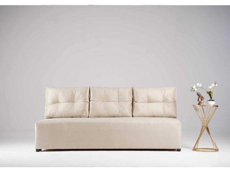 Mała sofa z funkcją spania odpowiednia dla pomieszczeń gdzie liczy się każdy centymetr. Wyposażona w duży pojemnik pod całą powierzchnią siedziska, niskie nogi zapewniające cyrkulację powietrza pod meblem oraz 3 pikowane poduszki oparciowe będzie sercem Twojego niewielkiego salonu.