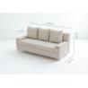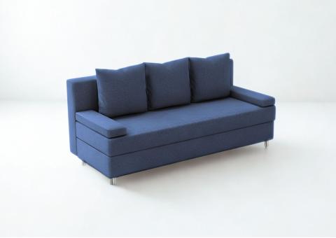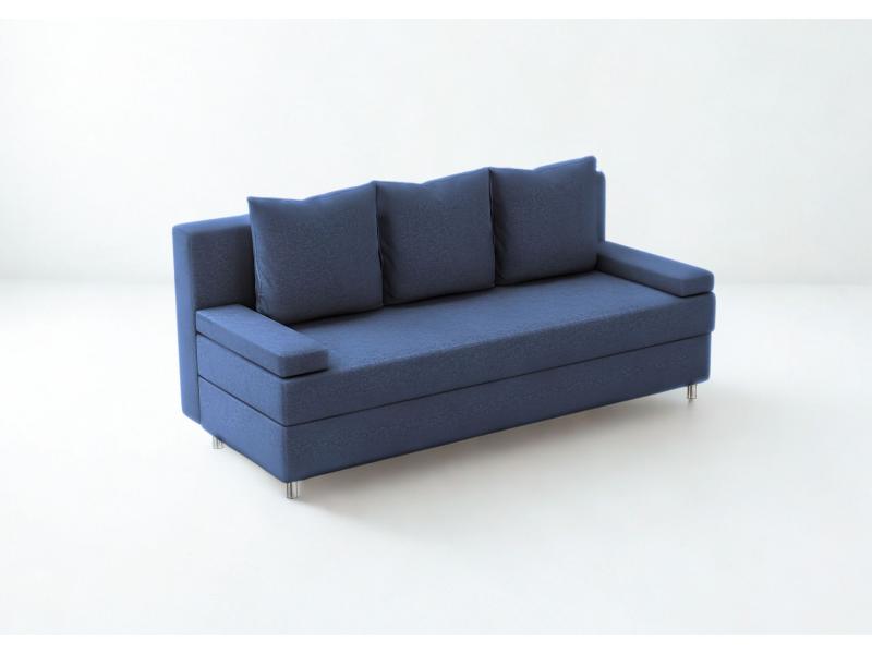 Prosta mała kanapa na srebrnych nogach o wysokości 6cm wyposażona w funkcję spania oraz dużą skrzynią na pościel. 3 duże poduszki szyte na zamkach oraz 2 piankowe podłokietniki nadają jej niebanalnego wyglądu. Sofa idealna dla małych pomieszczeń.