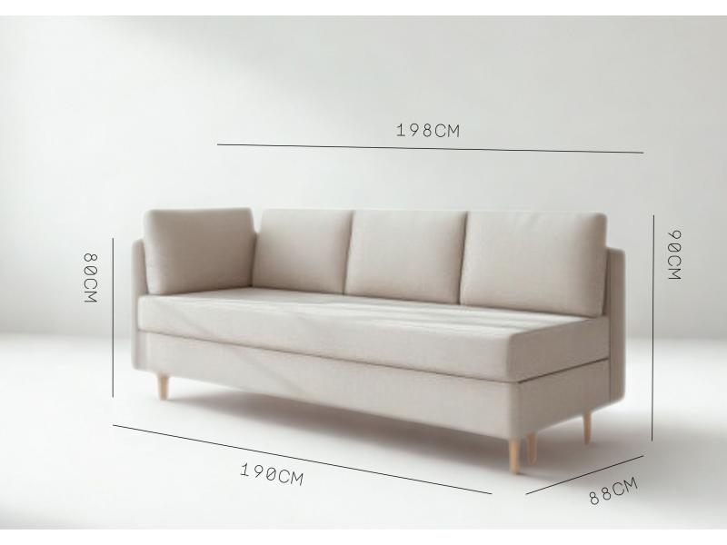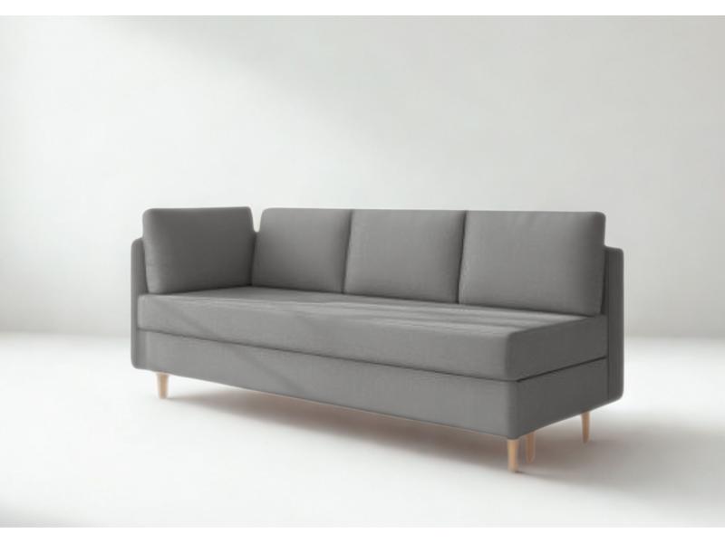 Lewa skandynawska sofa Prato wykonywana jest na drewnianych nogach w kolorze naturalnym. Możliwe jest wykonanie innego koloru nóg po kontakcie i ustaleniu z nami tej kwestii. Sofa posiada funkcję spania 190x140cm i duży pojemnik na pościel pod siedziskiem.