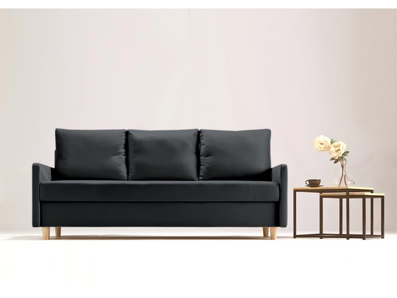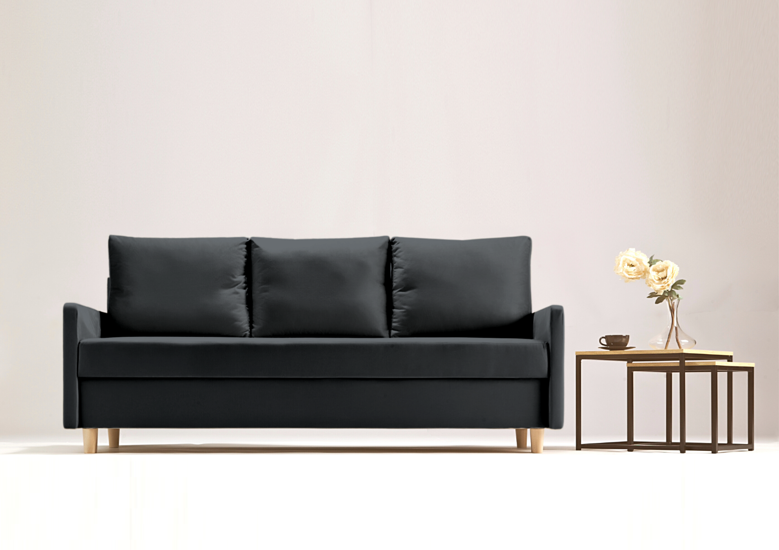 Sofa Rozkładana 3 Osobowa Arosa Welur Czarna Z Funkcją Spania i Schowkiem