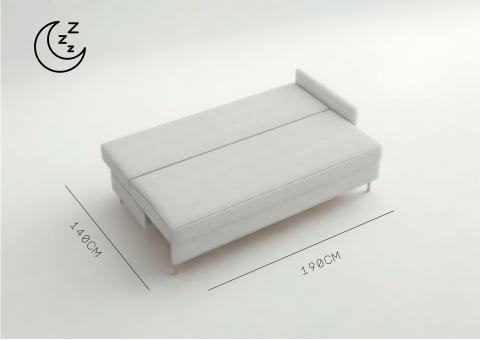 Prawa skandynawska sofa Prato wykonywana jest na drewnianych nogach w kolorze naturalnym. Możliwe jest wykonanie innego koloru nóg po kontakcie i ustaleniu z nami tej kwestii. Sofa posiada funkcję spania 190x140cm i duży pojemnik na pościel pod siedziskiem.
