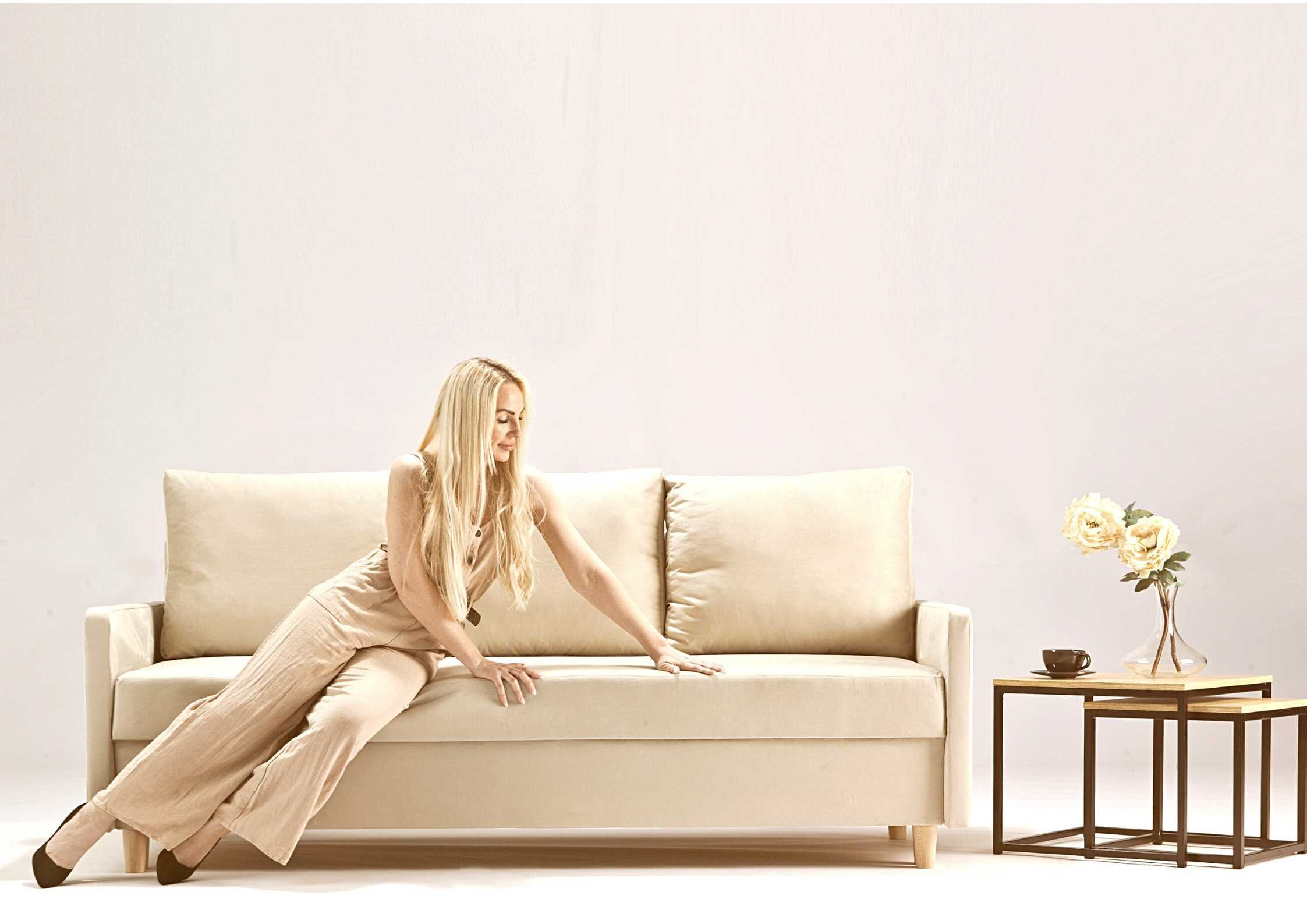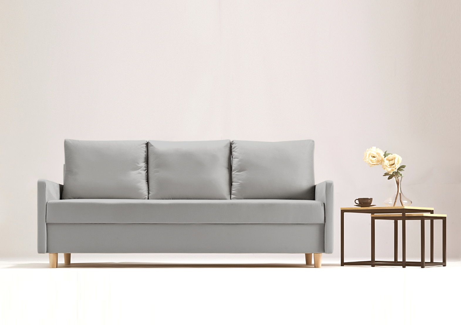 - Sofa z funkcją spania, który idealnie nada się zarówno do małego pokoju w bloku jak i w większych pomieszczeniach.