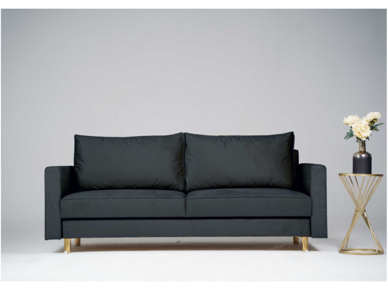 Elegancka sofa DES z funkcją spania. Sofa na złotych nogach dodaje szyku i elegancji do naszego salonu. Sofa dzięki swoim wymiarom będzie meblem idealnym dla każdego rodzaju pomieszczeń. Duża skrzynia na pościel, duże poduszki oparciowe i piękne przeszycia to dodatkowe atuty sofy DES. Sofa w stylu glamour