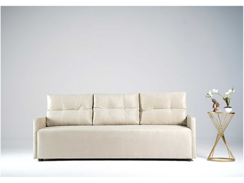Skandynawska mała sofa Vero z funkcją spania produkowana jest z dużym pojemnikiem na pościel oraz trzema dużymi pikowanymi poduszkami. Posiada niskie nóżki zapewniające cyrkulacje powietrza pod meblem.