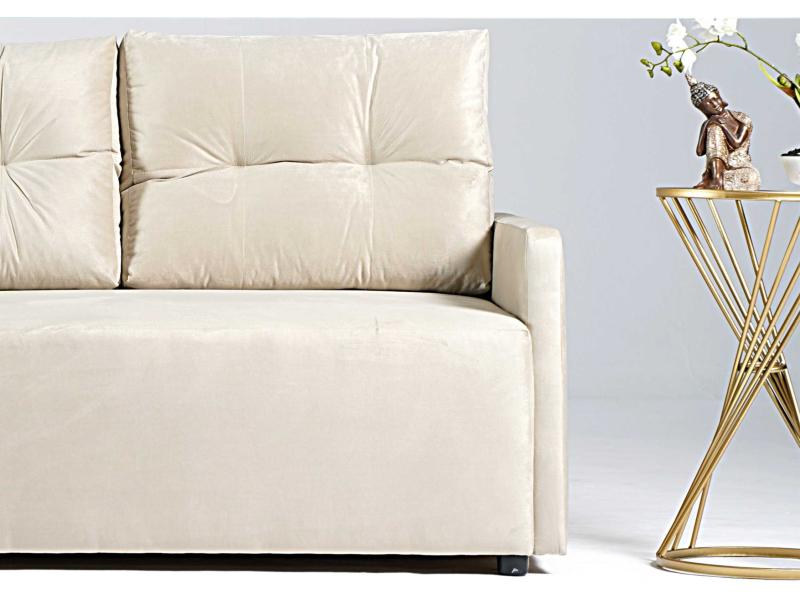 Skandynawska mała sofa Vero z funkcją spania produkowana jest z dużym pojemnikiem na pościel oraz trzema dużymi pikowanymi poduszkami. Posiada niskie nóżki zapewniające cyrkulacje powietrza pod meblem.