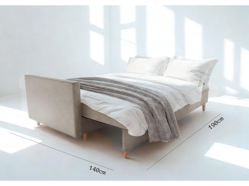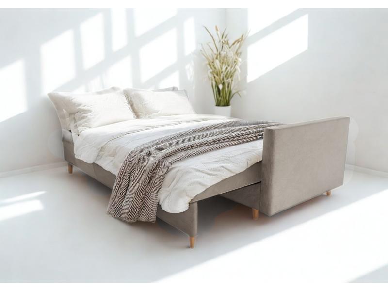 - Sofa z funkcją spania, który idealnie nada się zarówno do małego pokoju w bloku jak i w większych pomieszczeniach.