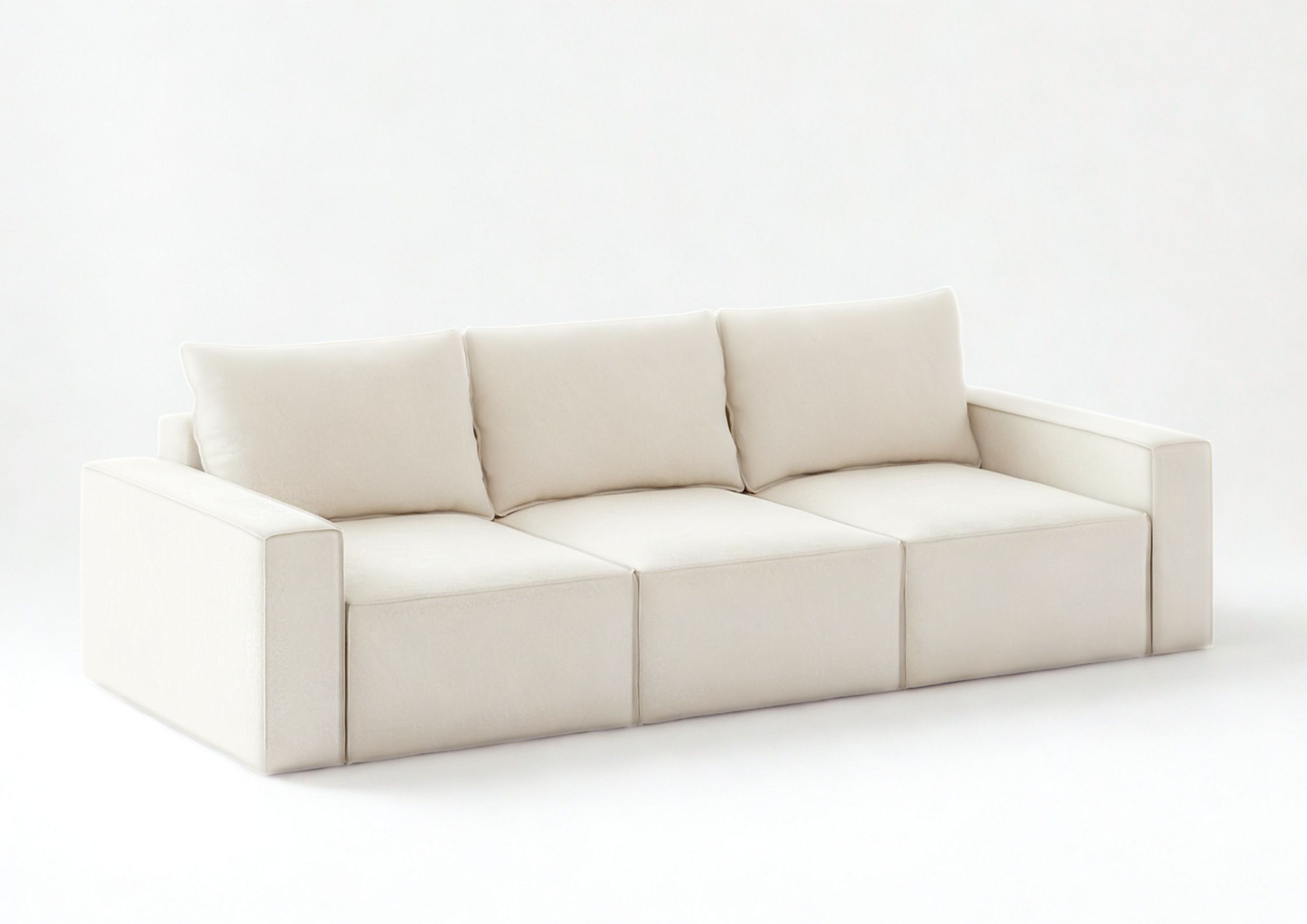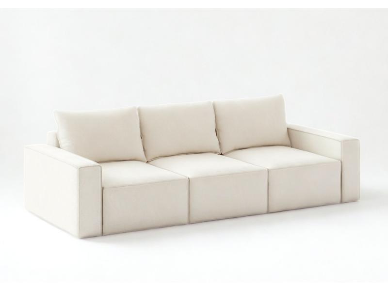 Modułowa sofa rozkładana SENS z pięknymi przeszyciami w stylu angielskim. Jest to szew zewnętrzny zastosowany na krawędziach mebla. Kanapa posiada 3 pojemniki na pościel. Po jednym pod każdym siedziskiem. Moduły możne rozłożyć niezależnie od innych. Po rozłożeniu wszystkich trzech uzyskamy dużą powierzchnię spania o wymiarach 240x160cm. Głębokość siedziska to 100cm. W zestawie znajdą Państwo 3 duże poduszki oparciowe.