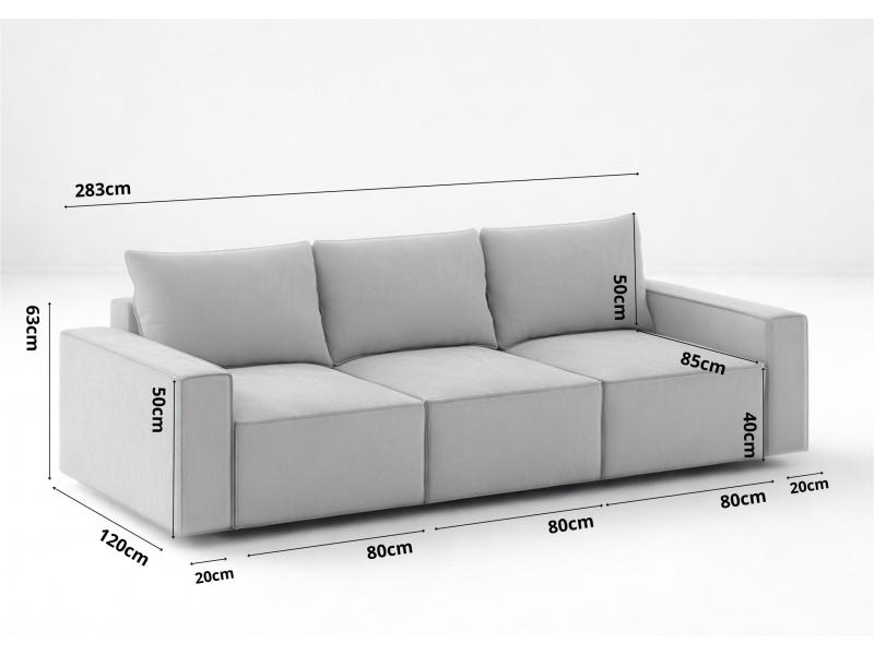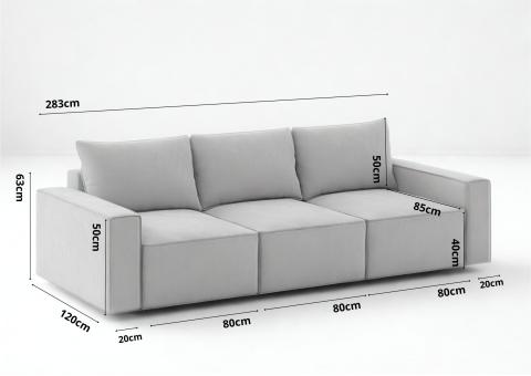 Modułowa sofa rozkładana SENS z pięknymi przeszyciami w stylu angielskim. Jest to szew zewnętrzny zastosowany na krawędziach mebla. Kanapa posiada 3 pojemniki na pościel. Po jednym pod każdym siedziskiem. Moduły możne rozłożyć niezależnie od innych. Po rozłożeniu wszystkich trzech uzyskamy dużą powierzchnię spania o wymiarach 240x160cm. Głębokość siedziska to 100cm. W zestawie znajdą Państwo 3 duże poduszki oparciowe.