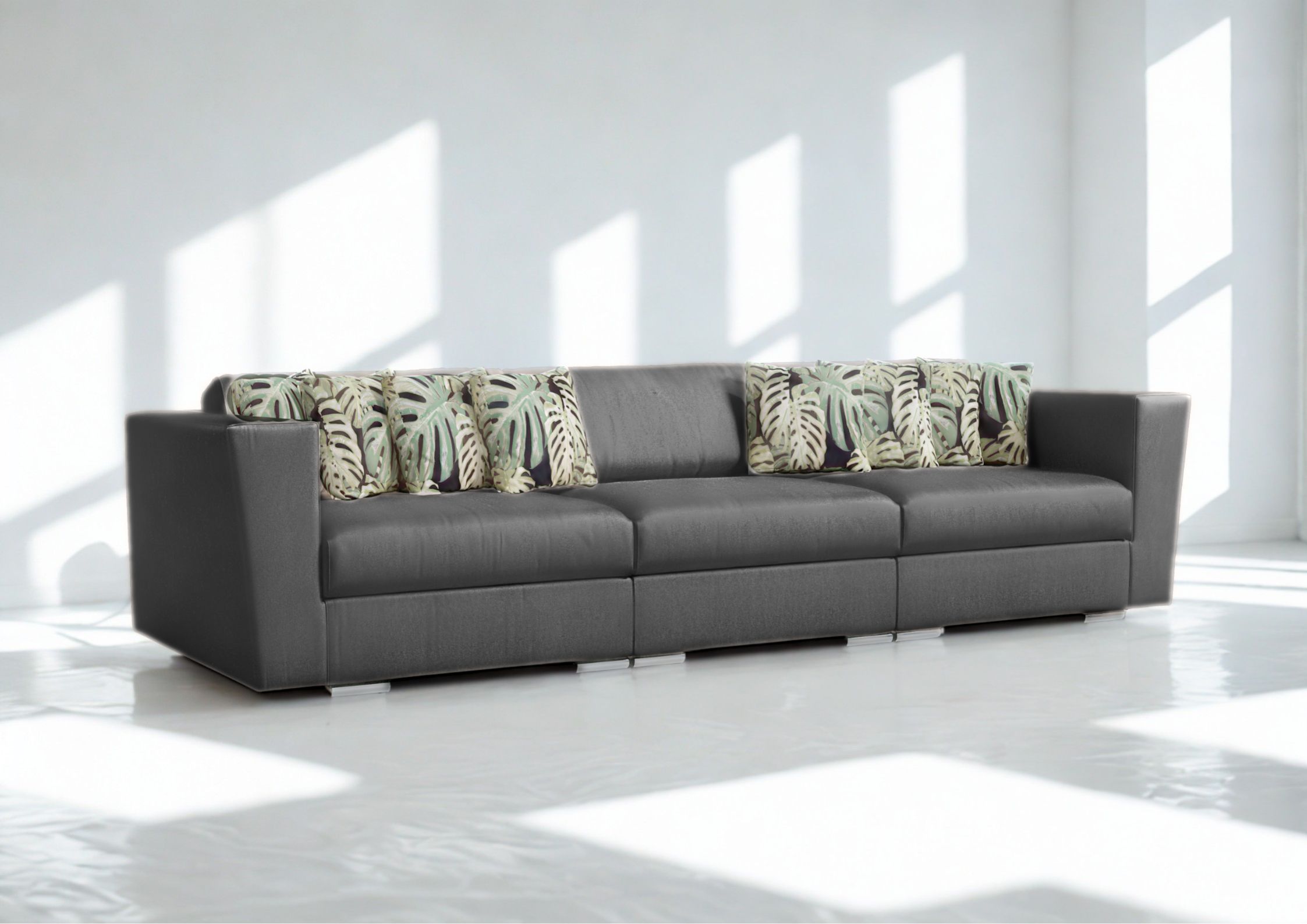 Duża nowoczesna sofa modułowa Jungle wykonana jest z 3 niezależnie rozkładanych modułów, które pod powierzchnią siedziskową kryją pojemniki na pościel. 3 duże poduszki oparciowe oraz 6 mniejszych dekoracyjnych jaśków, które sofa zawiera w komplecie dodają jej eleganckiego wyglądu.