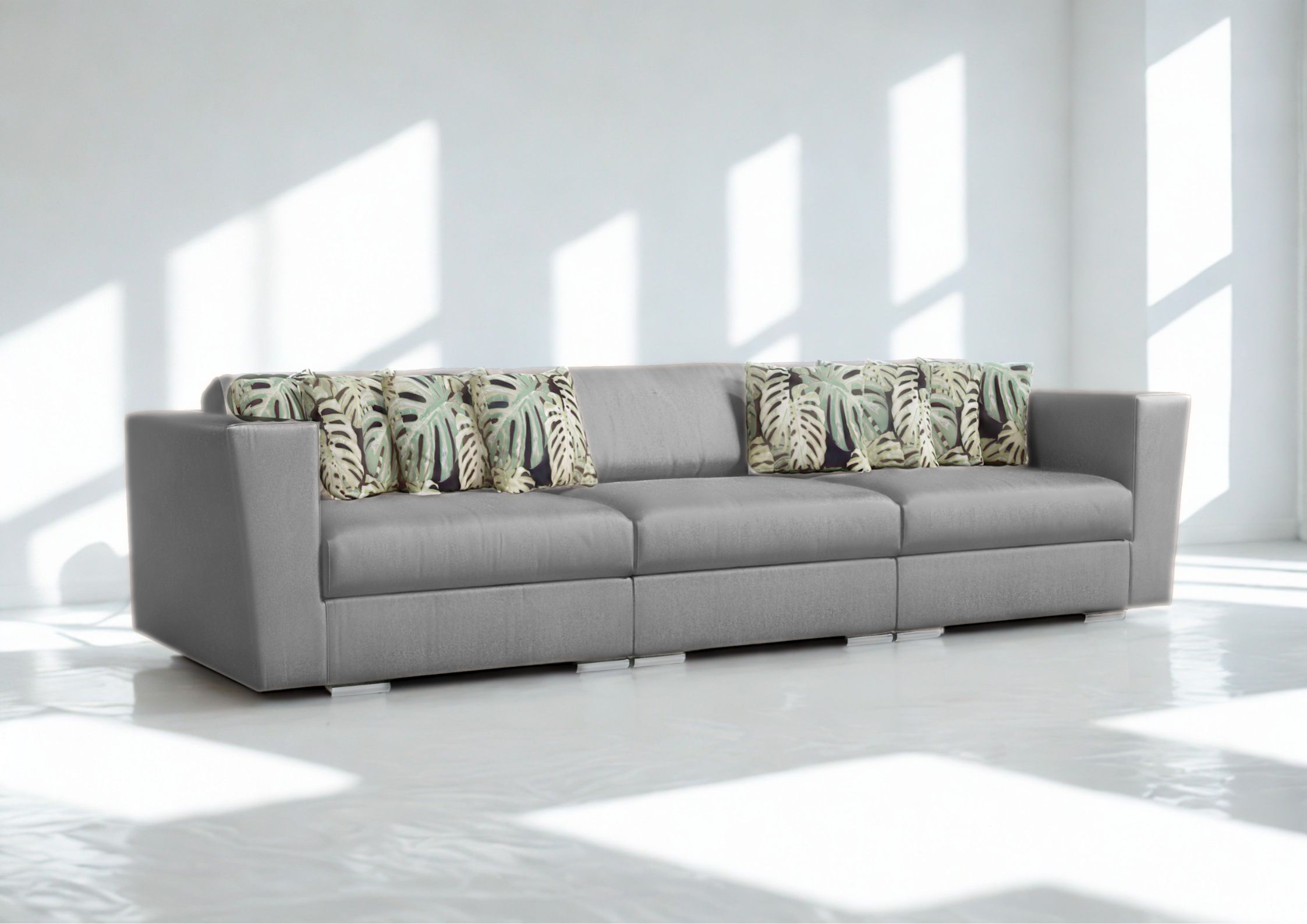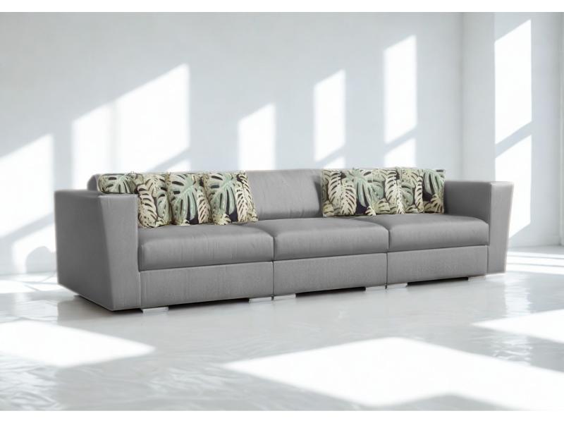 Duża nowoczesna sofa modułowa Jungle wykonana jest z 3 niezależnie rozkładanych modułów, które pod powierzchnią siedziskową kryją pojemniki na pościel. 3 duże poduszki oparciowe oraz 6 mniejszych dekoracyjnych jaśków, które sofa zawiera w komplecie dodają jej eleganckiego wyglądu.
